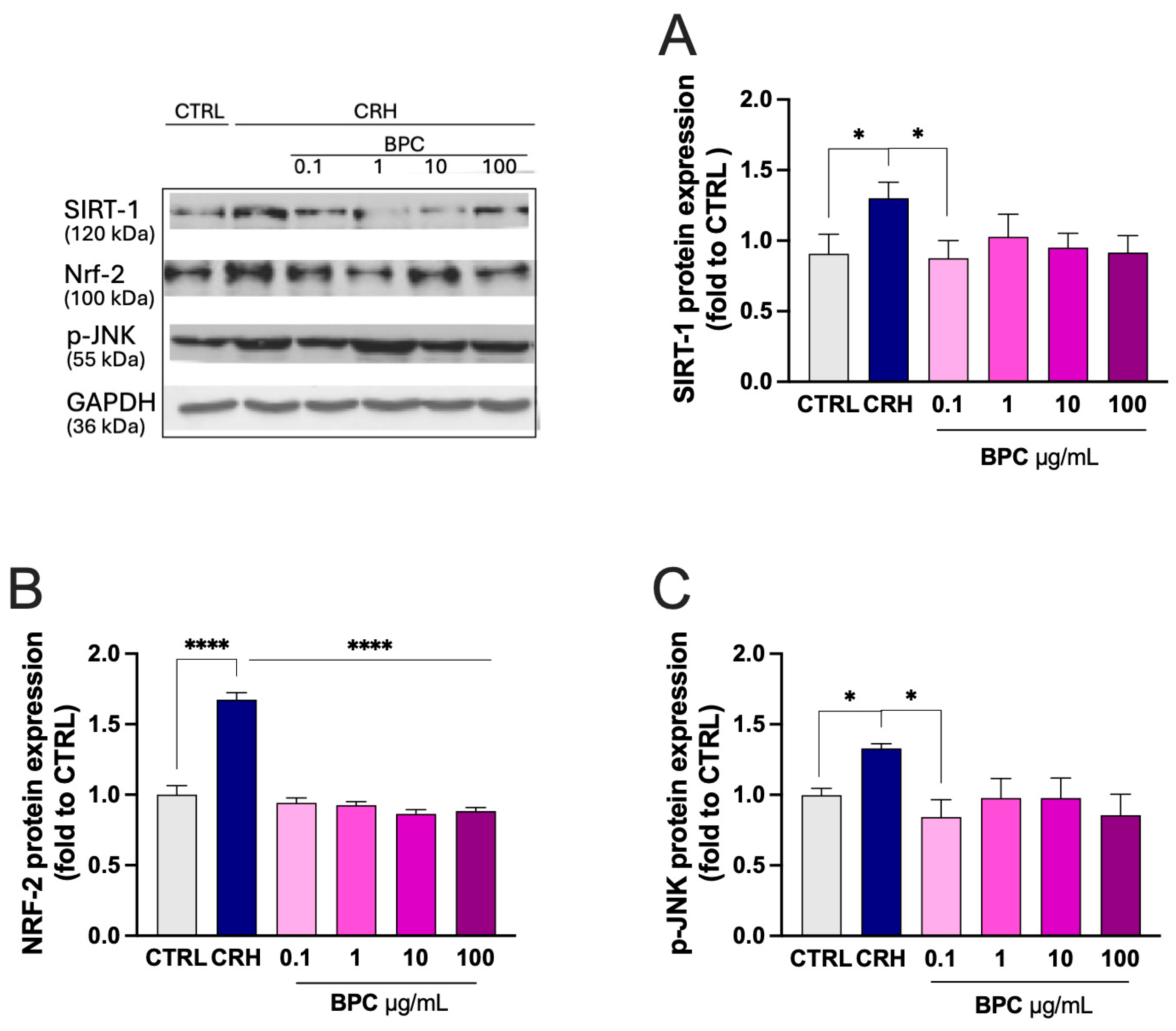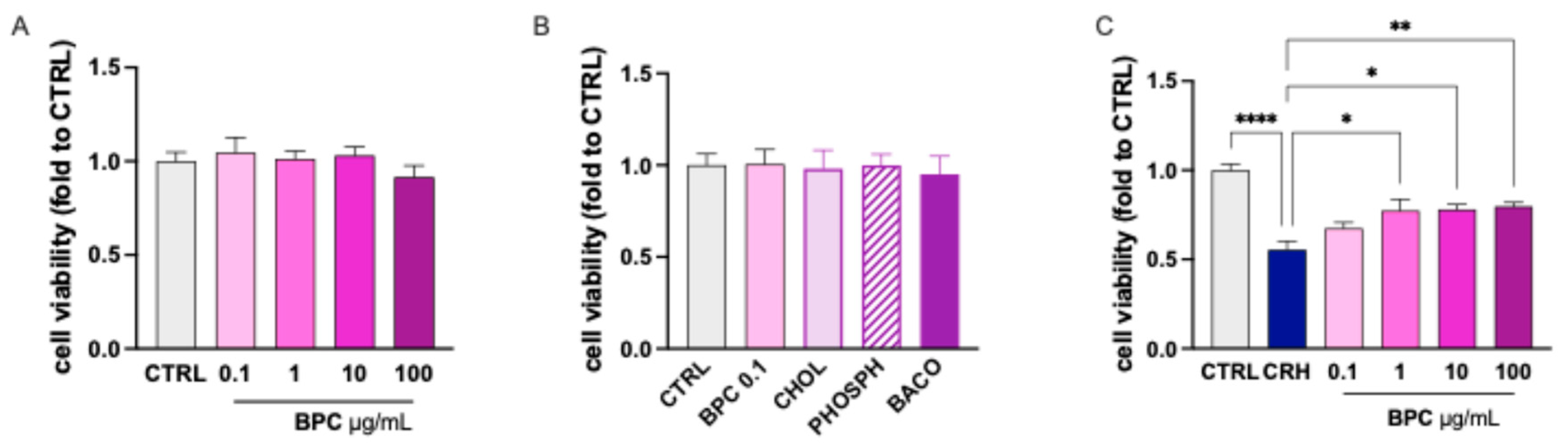 3.2.1. Effect of BPC on CRH-Induced Neurotoxicity on SH-SY5Y Cells
