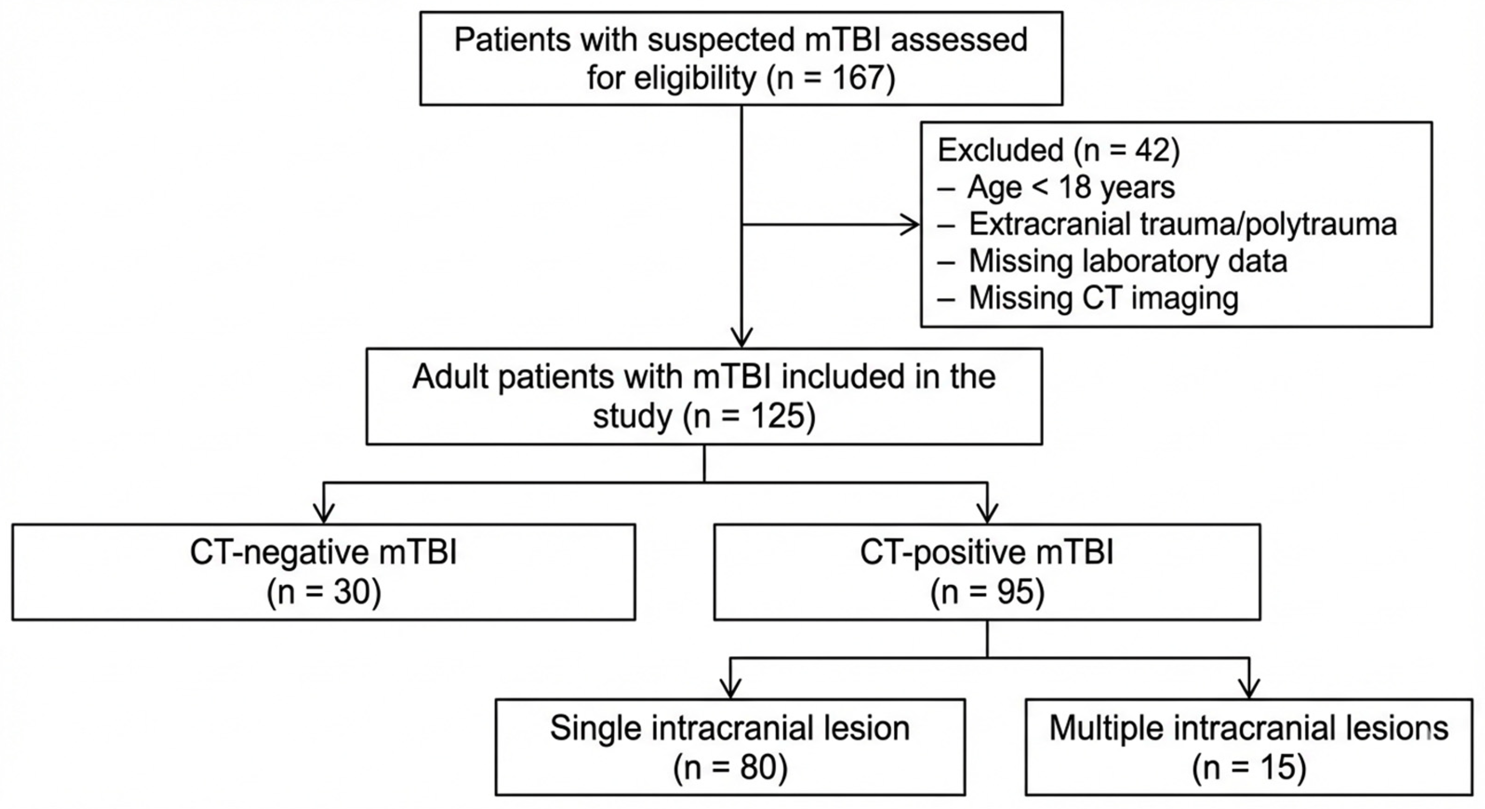 - Lampros, M.; Alexiou, G.A.; Symeou, S.; Vlachodimitropoulou, L.; Zerva, A.; Voulgaris, S. Admission blood glucose and neutrophil-to-lymphocyte ratio for differentiating CT-positive from CT-negative mild traumatic brain injury. Biomark. Med. 2026, 1, 1–9. [Google Scholar] [CrossRef]