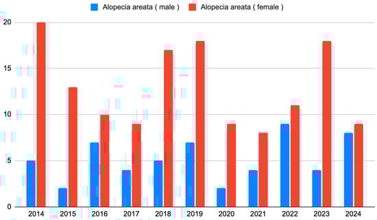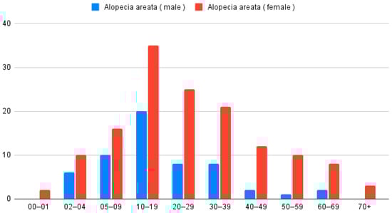 - Lee, H.H.; Gwillim, E.; Patel, K.R.; Hua, T.; Rastogi, S.; Ibler, E.; Silverberg, J.I. Epidemiology of alopecia areata, ophiasis, totalis, and universalis: A systematic review and meta-analysis. J. Am. Acad. Dermatol. 2020, 82, 675–682. [Google Scholar] [CrossRef] [PubMed]