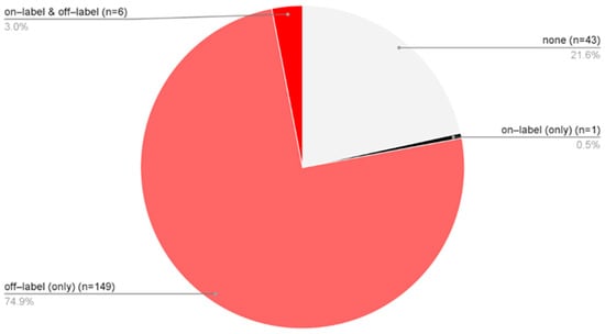 Treatment approaches varied among patients diagnosed solely with AA, allowing classification into four groups: 43 patients received no pharmacological therapy [none], 149 were treated exclusively with off-label medications [off-label (only)], 6 received a combination of on-label and off-label treatments [on-label & off-label], and 1 patient was managed solely in accordance with the SmPCs [on-label (only)] (Figure 4). In total, 77.9% of AA patients underwent some form of off-label therapy. When considering only the subgroup of patients who received pharmacological treatment, 99.4% were managed with off-label therapies.