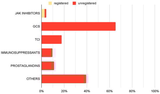 An analysis of pharmacological management revealed a variety of therapeutic approaches (Figure 5). GCS, including both oral and topical formulations, were the most frequently utilized off-label medications, administered in 65.3% of cases. TCIs were part of 17.6% of implemented therapies. Immunosuppressive agents (9.7%) and prostaglandin analogues (11.1%) were also employed. JAK inhibitors were prescribed in accordance with approved SmPC guidelines in 2.8% of cases, and 1.4% outside their approved use. Additionally other off-label treatments were implemented in 39.4% of cases.