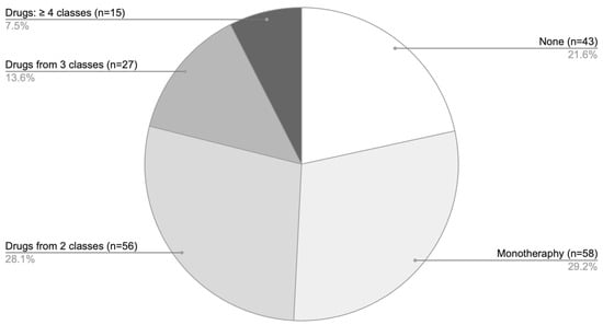 Analysis of pharmacotherapy by the number of agents showed that monotherapy was the predominant treatment approach (Figure 6), most commonly involving GCS. Combination regimens with two agents were somewhat less frequent, while the use of three or more drugs was comparatively rare.