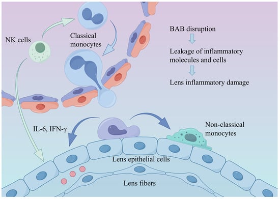 Alterations in the ocular immune microenvironment under diabetic conditions. Diabetes-induced hyperinflammation and disruption of the BAB promote monocyte recruitment and differentiation into non-classical monocytes, thereby exacerbating intraocular inflammation and leading to lens injury. BAB: blood–aqueous barrier.