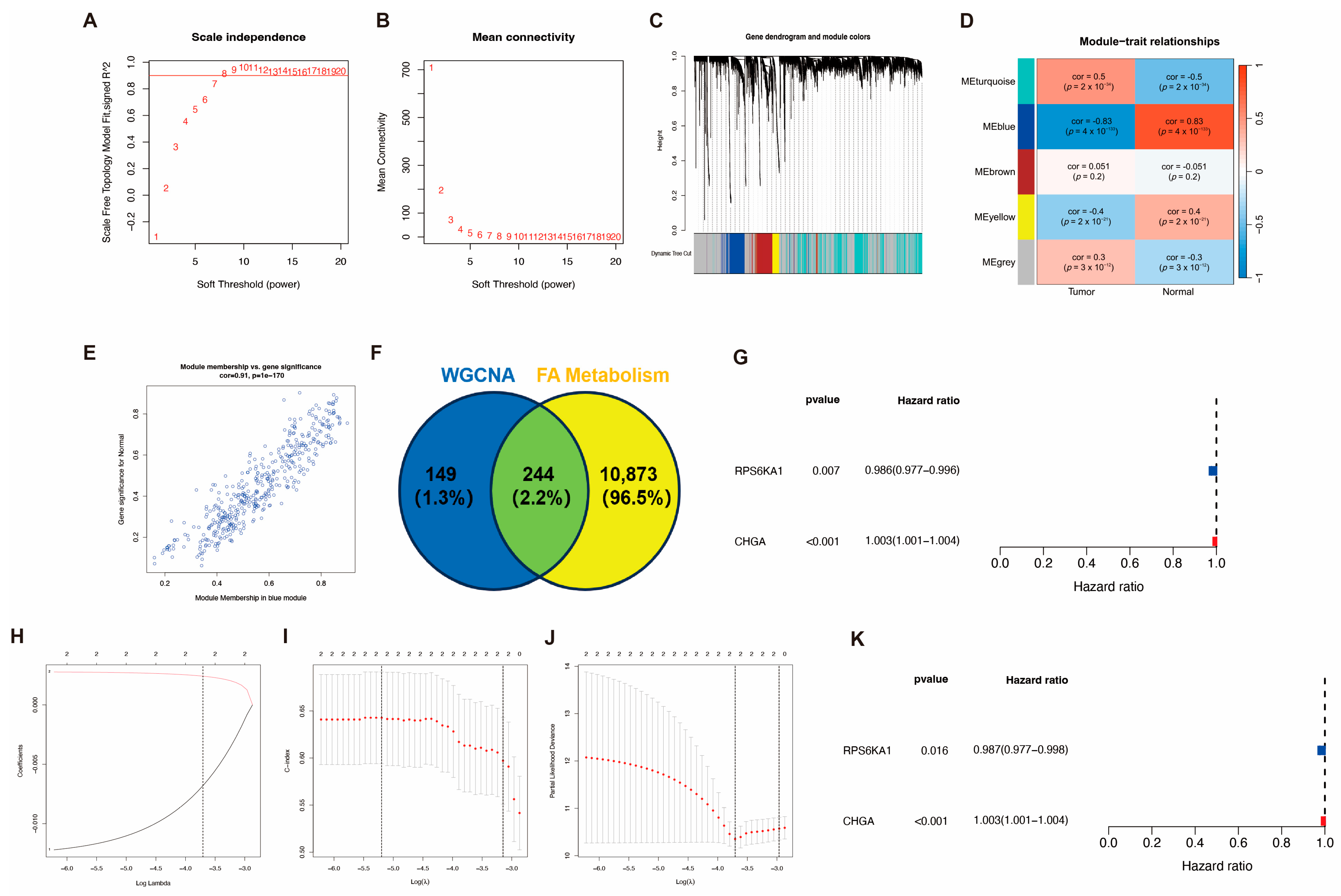 3.1. Identification of Fatty Acid Metabolism-Related Signature Genes in COAD