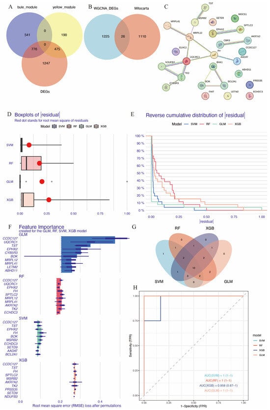 A total of 1136 mitochondrial-related genes were obtained from the MITOCARTA 3.0 online platform. Overlapping genes between DEGs, the blue and yellow modules from WGCNA, and mitochondrial-related genes were identified using Venn diagrams (Figure 4A,B), resulting in a set of 26 immune-related mitochondrial genes. The protein–protein interaction network for these genes is shown in Figure 4C. To identify hub genes with high diagnostic value, four well-developed machine learning models were employed: random forest (RF), support vector machine (SVM), the generalized linear model (GLM), and extreme gradient boosting (XGB). Samples in GSE58294 were divided into training and testing subsets in a 3:1 ratio. The training subset was used to train the machine learning models, and models SVM, GLM, and XGB exhibited relatively low residuals (Figure 4D,E). The top 10 essential feature variables for each model were ranked based on the root mean square error (RMSE) (Figure 4F). To evaluate the discriminative performance of the models, ROC curve analysis was performed. The area under the curve (AUC) values for the four machine learning models were high and comparable: GLM, AUC = 1; SVM, AUC = 1; RF, AUC = 1; XGBoost, AUC = 0.958 (0.87–1) (Figure 4H).