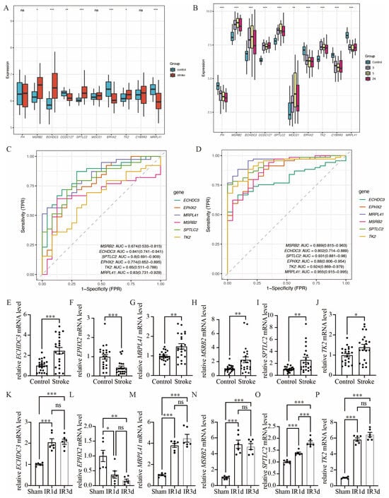 We used GSE16561 as an external validation dataset to analyze the gene expression levels of the common hub immune-related mitochondrial genes (Figure 5A). The expression pattern in GSE16561 was compared to that in GSE58294 (Figure 5B), and genes that exhibited the same direction of differential expression across both datasets were selected for further RT-qPCR analysis. This process identified six candidate genes: ECHDC3, EPHX2, MRPL41, MSRB2, SPTLC2, and TK2. We further validated these six genes using the RT-qPCR method on blood samples collected from acute ischemic stroke patients and control participants (Figure 5E–J). The baseline characteristics of the patients in the IS and control groups showed no significant differences (Supplementary Table S2). All six genes exhibited significant expression differences between the stroke group and the control group. However, the expression pattern of MRPL41 was inconsistent with the findings from both GSE58294 and GSE16561. In addition, we validated these hub genes in the mouse middle cerebral artery occlusion (MCAO) and SHAM model. Total RNA was extracted from the brain tissues of MCAO and SHAM mice, and gene expression was detected by RT-qPCR. The expression patterns of the five genes (ECHDC3, EPHX2, MSRB2, SPTLC2, and TK2) in mouse brain tissues were consistent with those observed in human peripheral blood samples (Figure 5K–P), further supporting their potential as conserved immune-related mitochondrial markers in ischemic stroke. Specifically, following ischemia–reperfusion (IR) injury, the expression of ECHDC3, MSRB2, SPTLC2, and TK2 showed a significant upregulation trend at both IR1d and IR3d time points, with SPTLC2 exhibiting the most pronounced increase at IR3d. In contrast, the expression of EPHX2 was markedly downregulated after IR, displaying an opposite expression pattern compared to the other genes. These results suggest that the expression changes in these genes after cerebral ischemia are time-dependent and direction-specific and may collectively participate in mitochondrial-related immune-regulatory processes. Thus, ECHDC3, EPHX2, MSRB2, SPTLC2, and TK2 were considered the hub immune-related mitochondrial genes in this study.