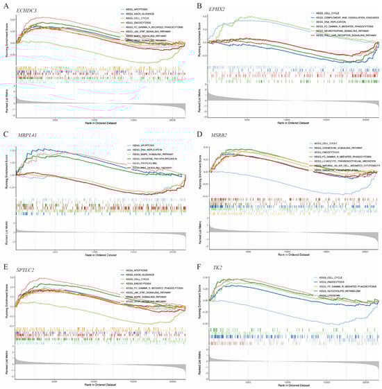 GSEA of the hub immune-related mitochondrial genes. (A–F) show pathways enriched by GSEA associated with ECHDC3, EPHX2, MRPL41, MSRB2, SPTLC2, and TK2, respectively.
