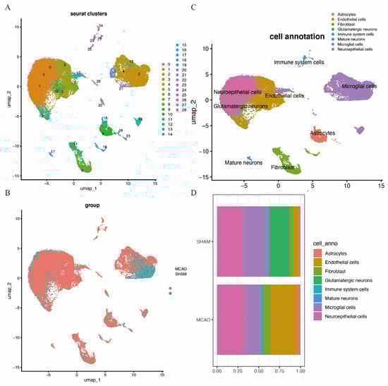 A quality control procedure was performed on the GSE174574 dataset. As shown in Supplementary Figure S3, cells with low UMIs, low RNA features and a high ratio of mitochondrial expressed genes were removed. This process reduced the total cell count from 58,523 to 36,667. Following quality control, UMAP clustering was performed, resulting in 28 clusters (Figure 9A). The clustering of cells from MCAO and SHAM brain tissues is depicted in Figure 9B. Further cell annotation identified eight distinct cell types, including astrocytes, endothelial cells, fibroblasts, glutamatergic neurons, immune cells, mature neurons, microglia, and neuroepithelial cells, as shown in Figure 9C. Figure 9D highlights the distribution of these cell types in the two mouse models, revealing an increase in endothelial cells, fibroblasts, neuroepithelial cells, and immune cells in the MCAO brain, with a decrease in microglial cells and glutamatergic neurons.