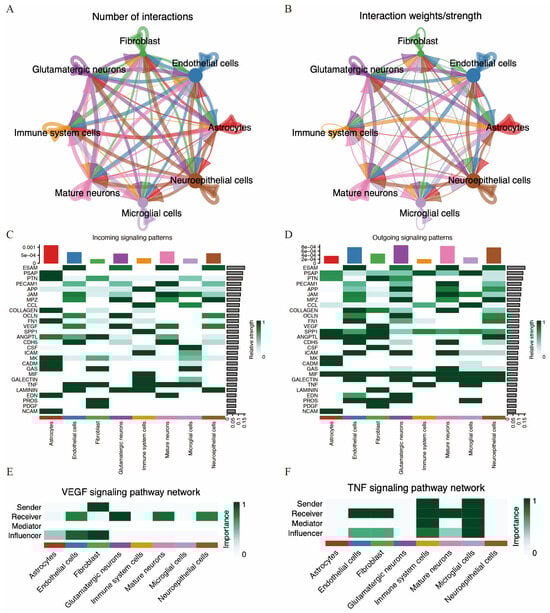 Cell communication in MCAO mouse brain. (A,B) Number of cell–cell interactions and total interaction strength. (C,D) Heatmaps displaying the intensity of incoming and outgoing interactions among different cell subpopulations. (E,F) Strength of VEGF and TNF signaling pathway among different cell types.