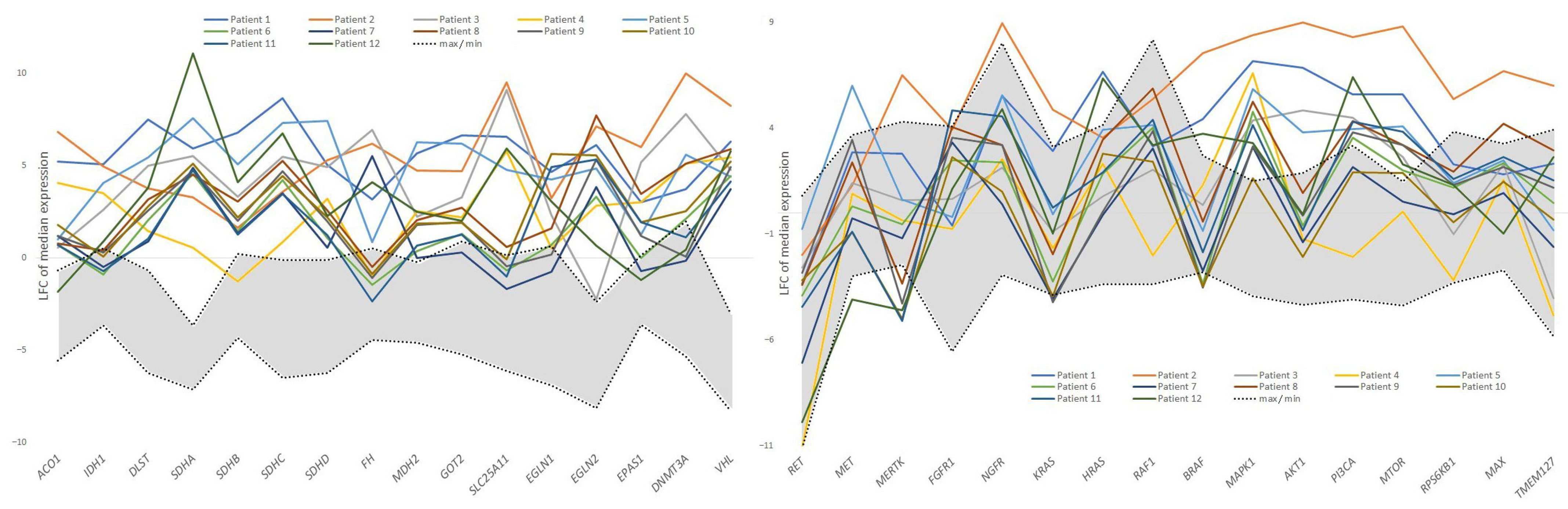 While RNA sequencing is the gold standard for mutation detection, it cannot reliably identify many functionally relevant mutations in noncoding regions. Therefore, we supplemented our analysis with data on the most common PCC-associated mutations, as documented in public databases and the literature. These include primarily germline mutations in Krebs cycle genes. In contrast, mutations in kinase pathway genes are usually somatic, with single germline mutations most frequently found in RET and NF1.
