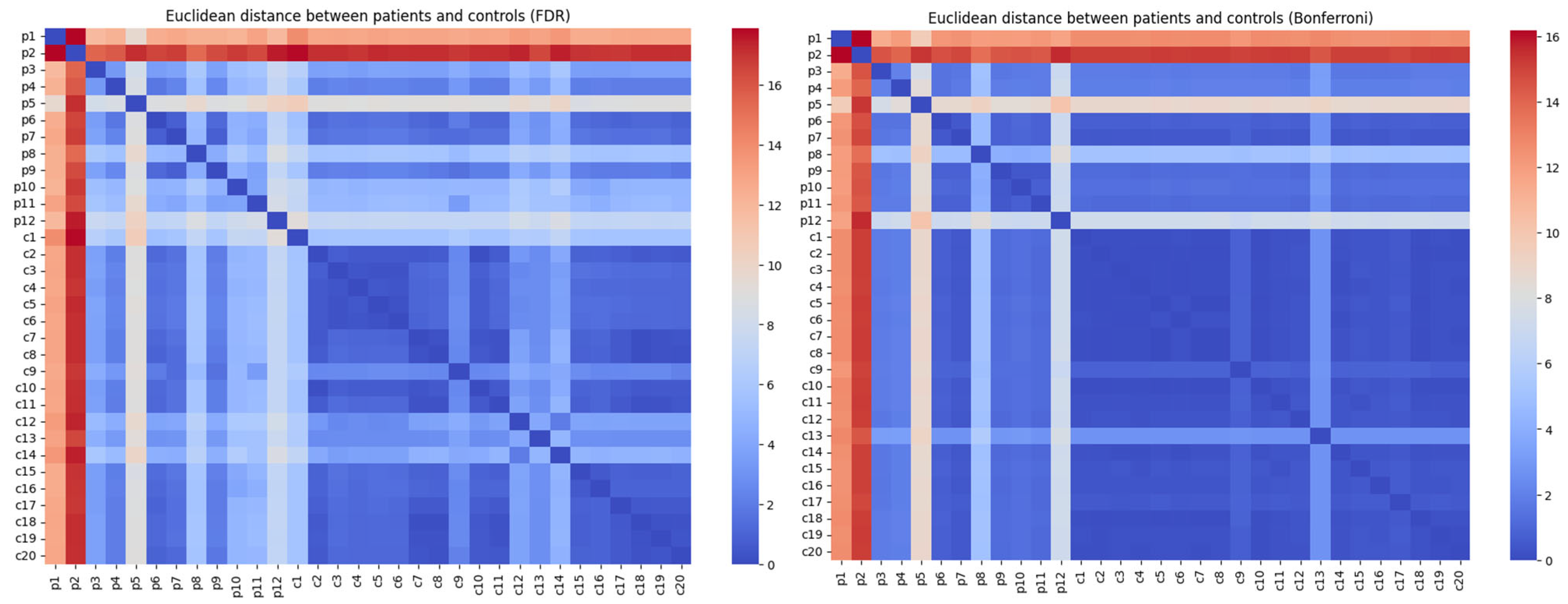 The clustering obtained using the more stringent Bonferroni-corrected gene set appeared more distinct and less noisy, potentially highlighting core differences between patients and controls. The visualizations revealed two distinct groups: the first group includes controls; the second group includes only patients. The resulting visualization largely matches the data description using the pairwise distance matrix.