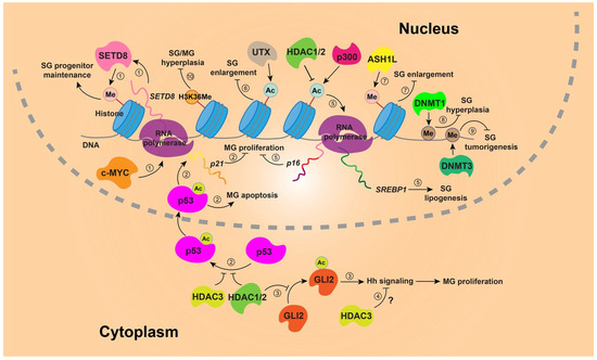 Diagram showing histone-modifying enzymes and DNA modifications in SG and MG. ① c-MYC promotes the transcription of SETD8 mRNA, and SETD8 protein catalyzes histone methylation, which is required for SG progenitor maintenance. ② Acetylation of p53 enhances its stability and function, allowing it to enter the nucleus and induce p21 expression, thereby inhibiting MG cell proliferation. p53 also promotes apoptosis in MG cells. HDAC1/2 and HDAC3 remove p53 acetylation to suppress the p53 pathway. ③ HDAC1/2 deacetylate GLI2, a mediator of Hh signaling that maintains MG cell proliferation. ④ HDAC3 also suppresses the Hh pathway through an unknown mechanism in MG cells. ⑤ HDAC1/2 remove histone acetylation to induce p16 expression, which may inhibit MG proliferation. Meanwhile, HDAC1 and p300 inhibit or promote histone acetylation, respectively, thereby regulating SREBP1 expression to control lipid synthesis in sebocytes. ⑥ UTX promotes histone acetylation to inhibit SG enlargement. ⑦ ASH1L facilitates DNA methylation to suppress SG enlargement. ⑧ DNMT1 suppresses SG overgrowth by catalyzing DNA methylation. ⑨ DNMT3 reduces SG tumor susceptibility by mediating DNA methylation. ⑩ H3K36 methylation suppresses SG/MG hyperplasia.