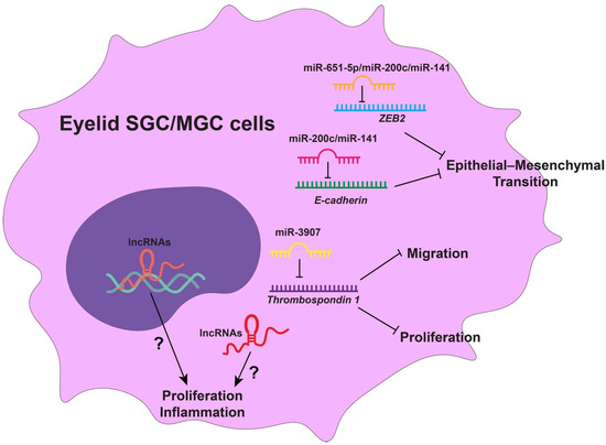 At a broader level, transcriptomic analyses have identified hundreds of differentially expressed lncRNAs in MGC, many of which are linked to inflammatory pathways and tumor cell proliferation [149], suggesting additional layers of epigenetic control in SG/MG pathology. Figure 3 summarizes ncRNAs known or potentially involved in eyelid SG and MG tumorigenesis.