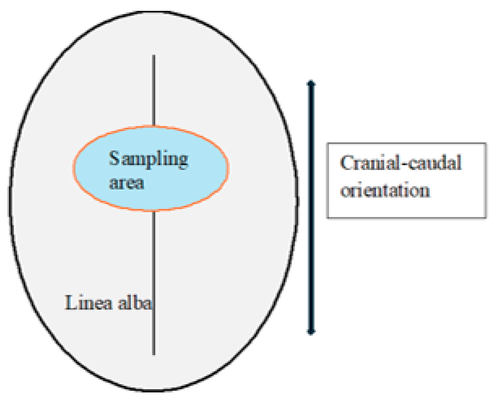Specimen orientation was preserved during excision and preparation, with the longitudinal axis of each sample aligned parallel to the predominant collagen fiber direction of the linea alba. A schematic representation of the standardized sampling location and orientation is provided in