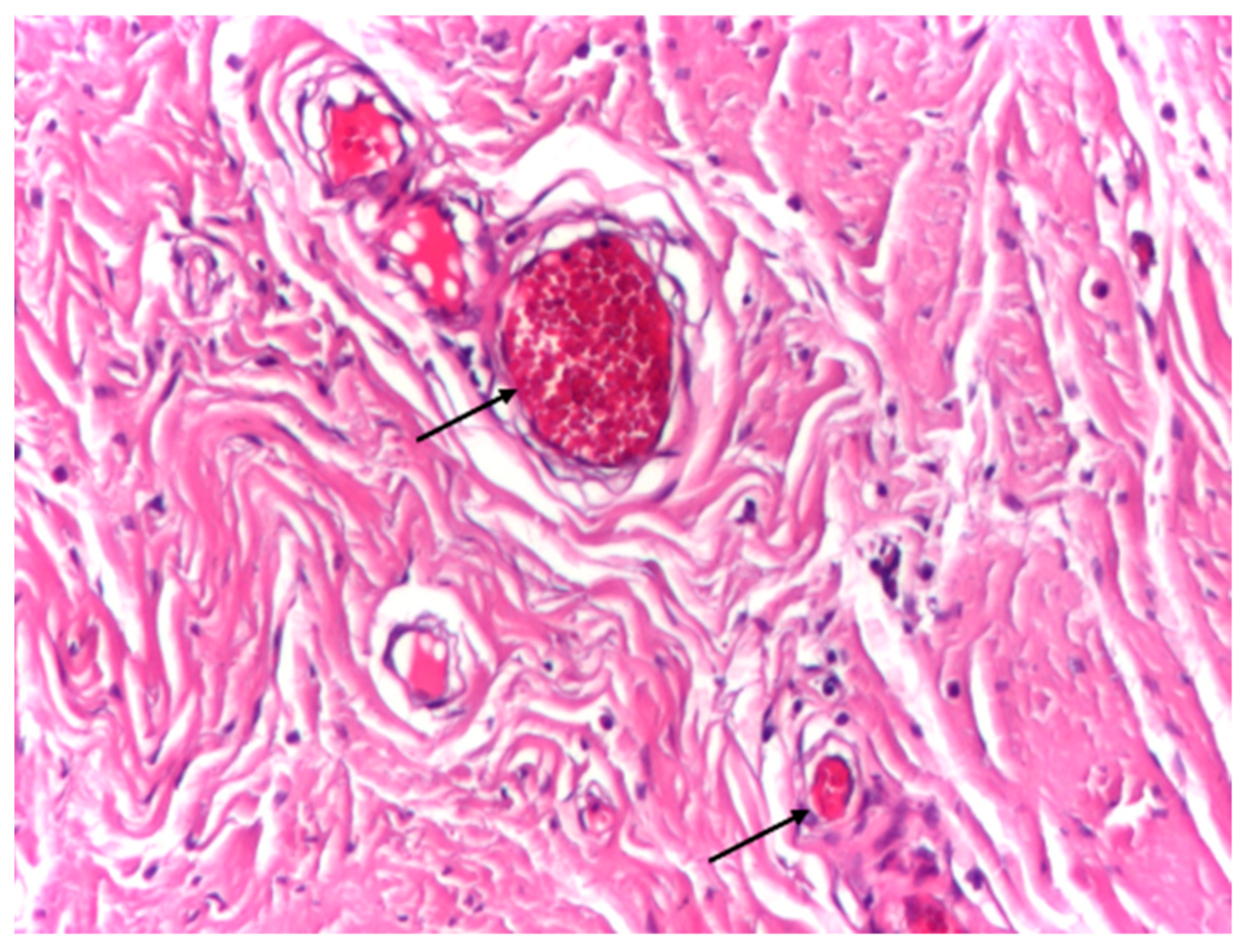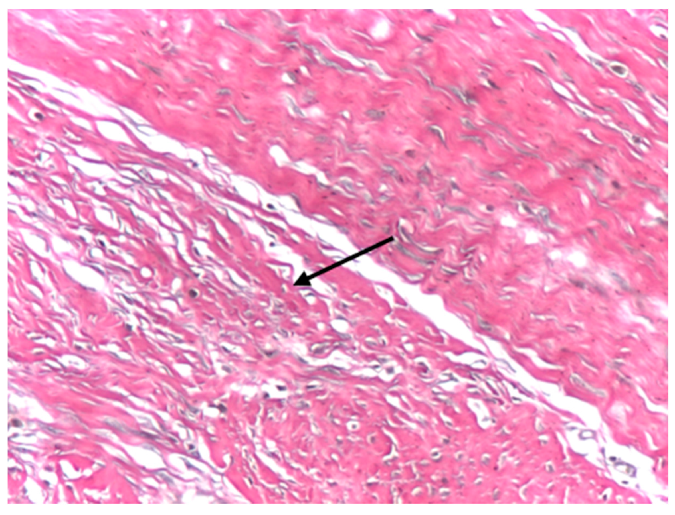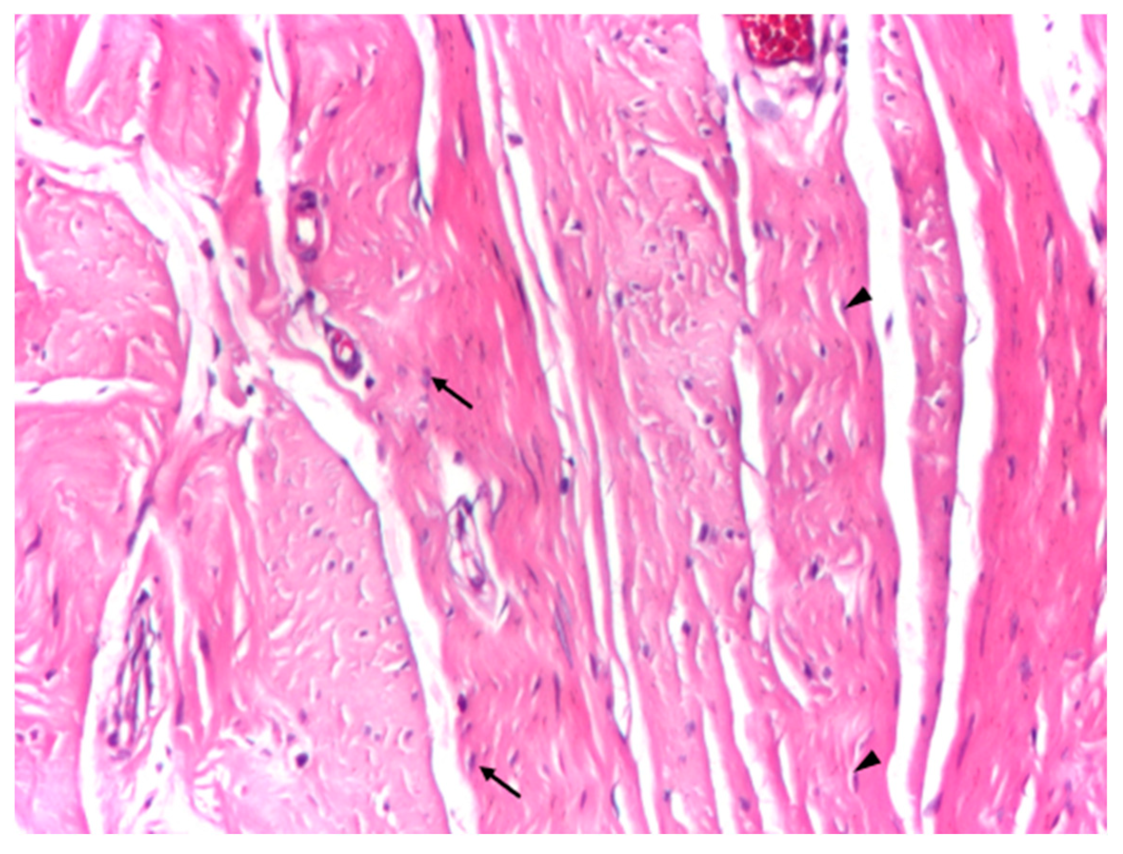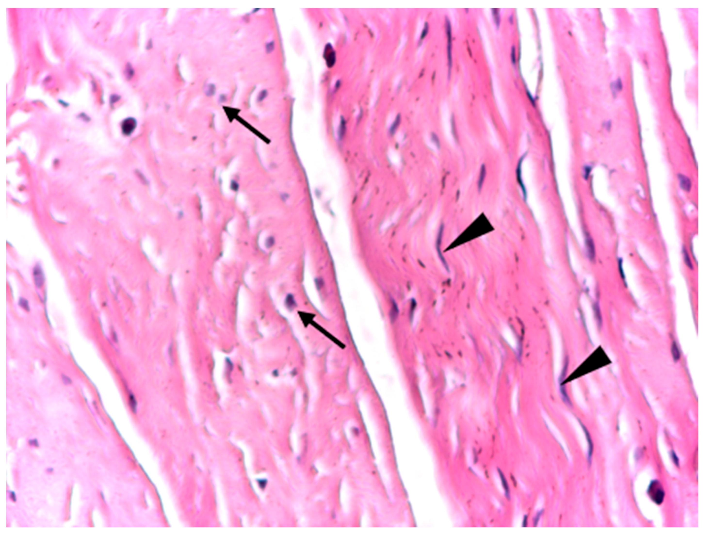Optical microscopy was performed using a light microscope equipped with digital image acquisition. Representative images were captured at low, medium, and high magnifications (×4, ×10, and ×20) to evaluate overall tissue architecture, collagen fiber organization, cellular composition, and vascular features. Particular attention was paid to collagen bundle orientation, fiber parallelism, and the presence and distribution of resident connective tissue cells, including fibrocytes and fibroblasts.