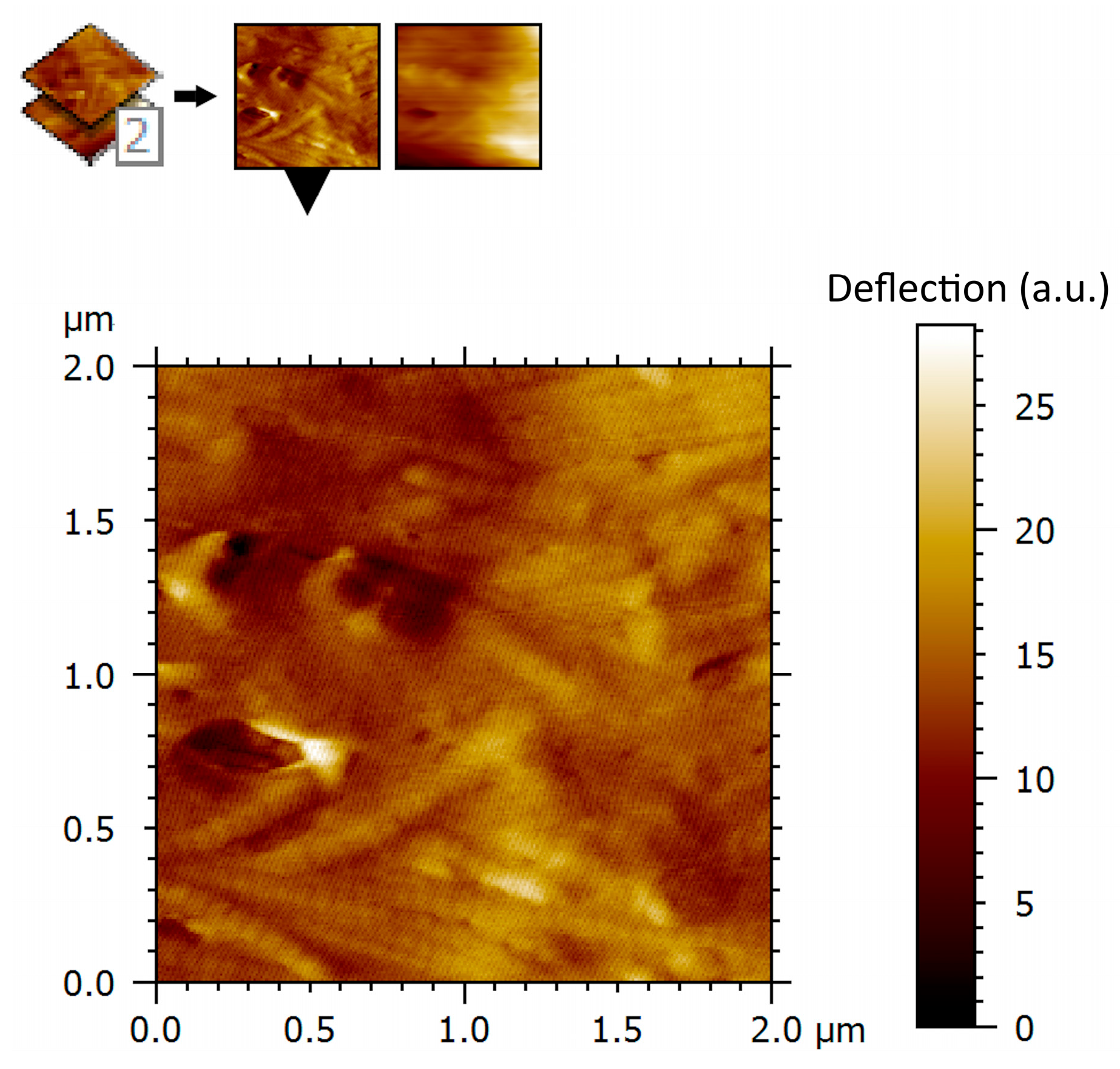 AFM deflection imaging was used to assess relative spatial variations in the local tip–sample interaction during contact-mode scanning. In this mode, the deflection signal reflects cantilever bending induced by mechanical interaction with the tissue surface. Deflection contrast was interpreted qualitatively, in a comparative manner within and between scans, as an indicator of local heterogeneity in surface interaction properties. No absolute mechanical parameters were derived from deflection images.