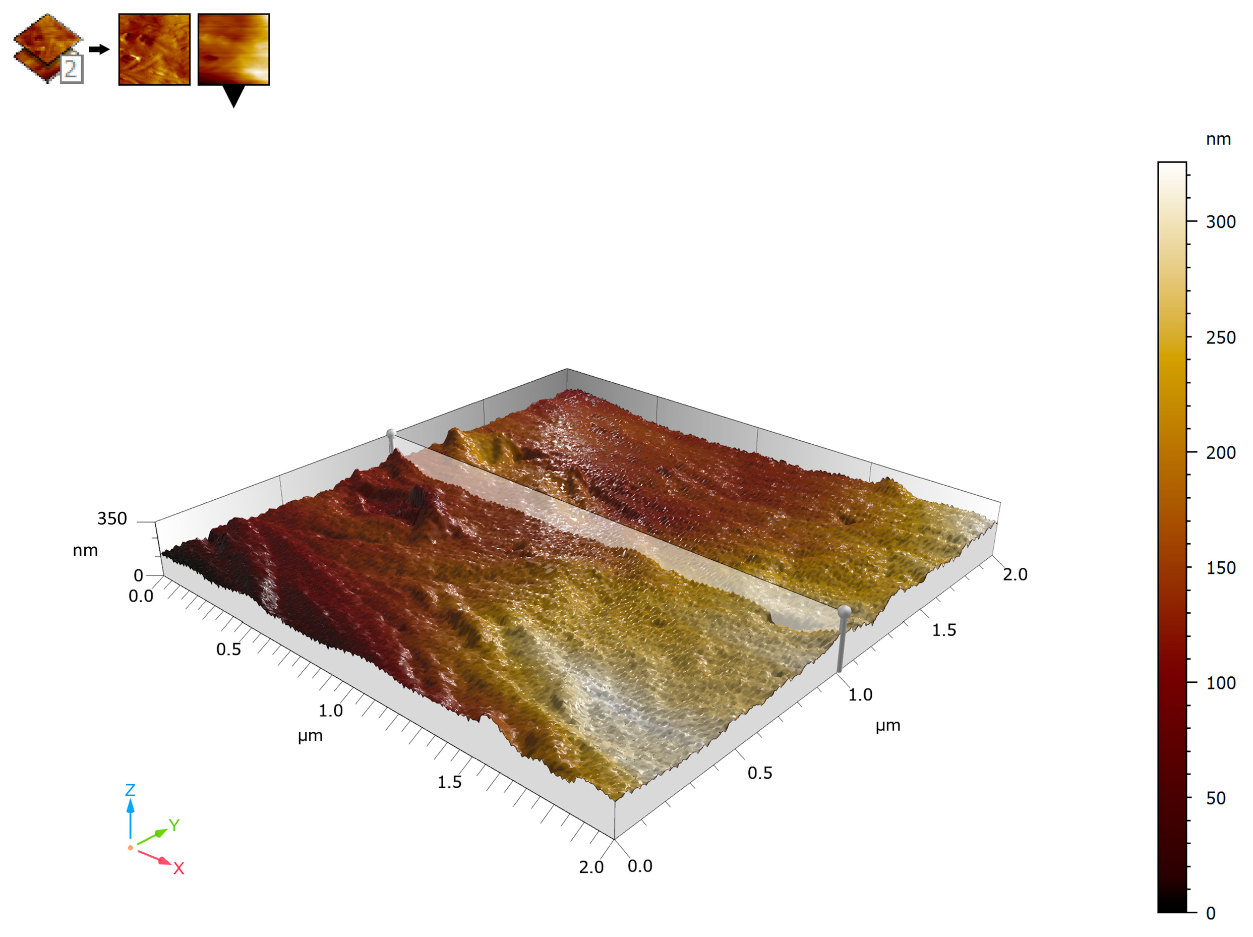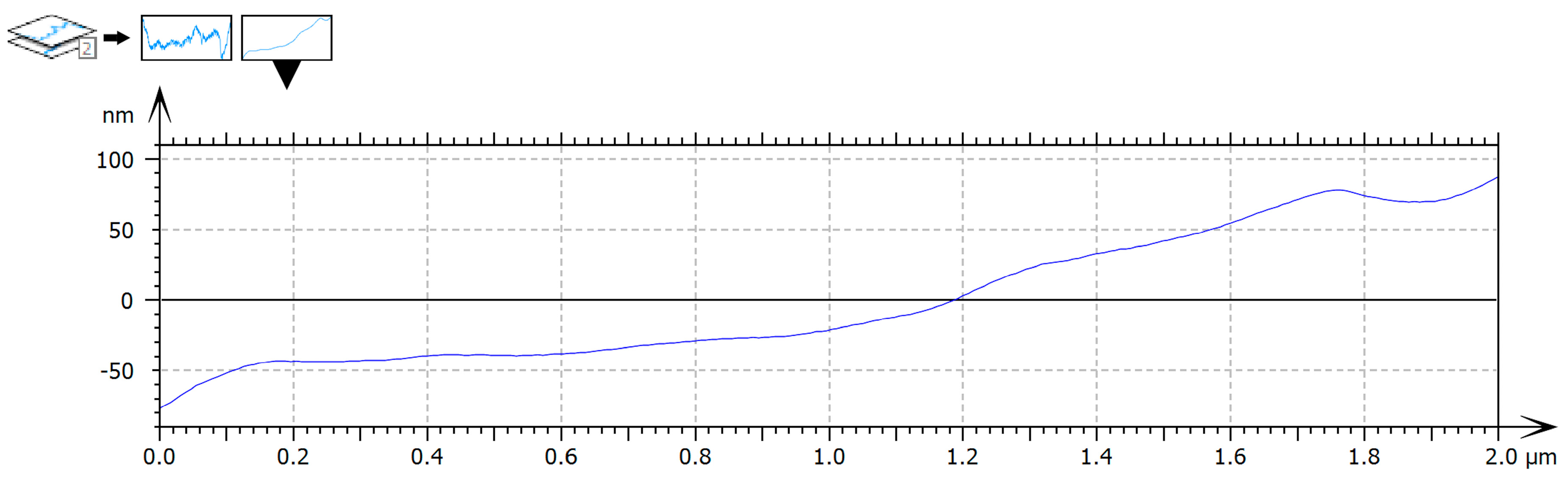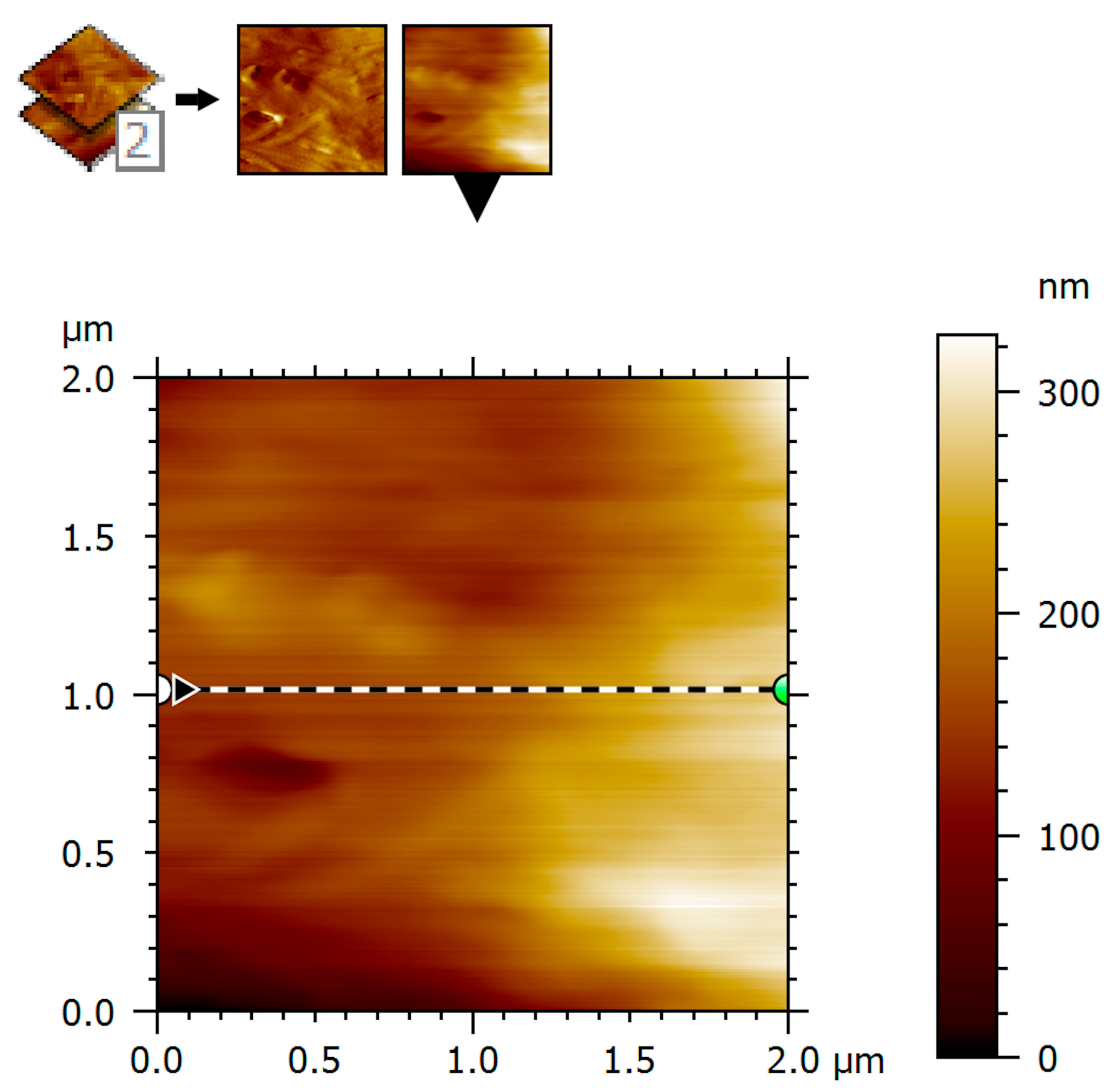Surface profiles were extracted from selected regions of interest within the height maps to visualize local height variations and to correlate topographic depressions and elevations with structural features observed in AFM images. Profile analysis was performed along representative scan lines within the imaged areas.