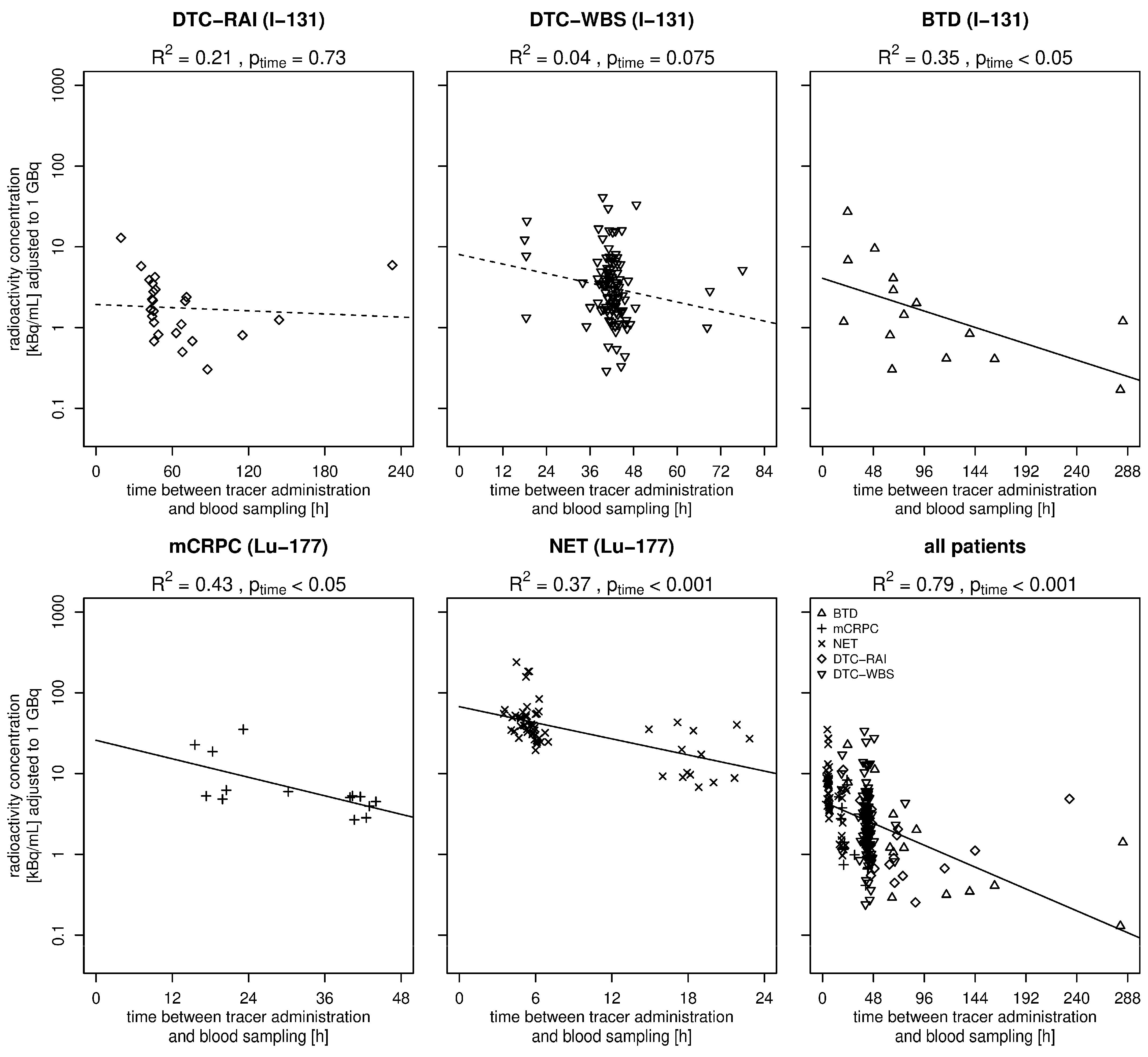 | Time between tracer administration and blood sampling [h] | 52.0 ± 37.0; 43.0 (18.0–283.5) | 65.5 ± 42.8; 46.3 (19.6–233.1) | 42.0 ± 7.2; 42.0 (18.0–78.0) | 101.9 ± 80.9; 66.8 (20.0–283.5) |