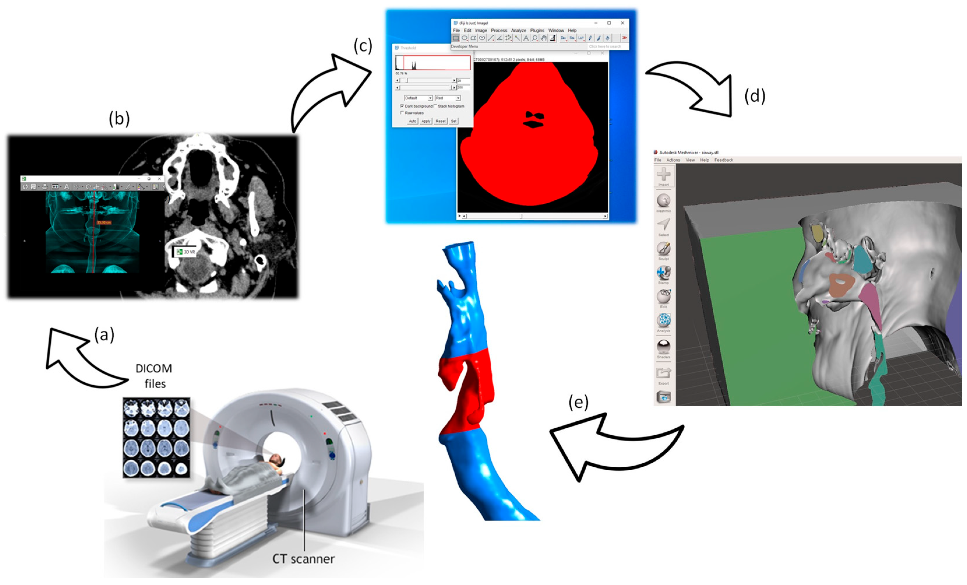 For physiologically accurate CFD analysis, obtaining realistic anatomical geometries of the respiratory tract and the epiglottis is essential. High-resolution CT scans provide detailed 3D reconstructions, enabling precise simulations that reflect real physiological conditions. The workflow from CT scan to the 3D reconstruction is presented in