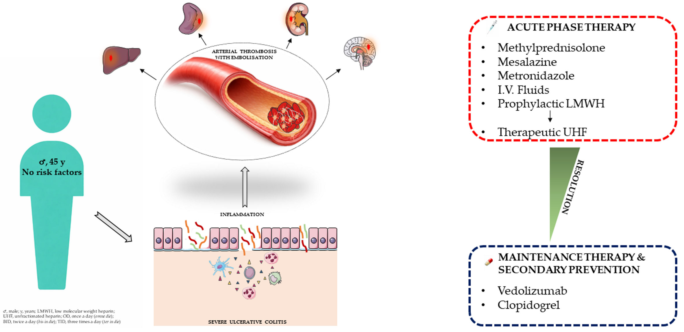 Kralj, D.; Maksic, M.; Ivanovski, T.K.; Odanovic, O.; Maksic, T.; Gmizic, T.; Ivosevic, Z.; Radojevic, D.; Suljic, L.; Todorovic, N.; et al. Arterial Thrombosis in Severe Ulcerative Colitis: A Case-Based Narrative Review of Current Evidence. Biomedicines 2026, 14, 559. https://doi.org/10.3390/biomedicines14030559