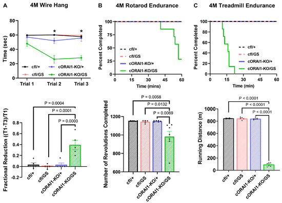 Homotypic cORAI1-KO/GS mice exhibit muscle weakness and exercise intolerance. (A) Wire-hang test of 4M cfl/+, cfl/GS, cORAI1-KO/+, and cORAI1-KO/GS mice where the time mice remain hanging on the grip were plotted (upper). The fractional reduction in hanging time was calculated as the difference in latency between the first grip (T1) and the third grip (T3), divided by the latency of the first grip: (T1-T3)/T1 (lower). (B,C) Rotarod endurance (B) and treadmill endurance (C) tests in 4M cfl/+, cfl/GS, cORAI1-KO/+, and cORAI1-KO/GS mice where the fraction of mice remaining on the apparatus during experiment (upper) and the total running distance (lower) were plotted. Significance was assessed using a two-way ANOVA (A) or one-way ANOVA (B,C), followed by Tukey’s multiple-comparisons post hoc test. * indicates p < 0.05 for cORAI1-KO/GS vs. cfl/+, cfl/GS and cORAI1-KO/+ mice. For bar graphs, the exact p-values are shown where p < 0.05.
