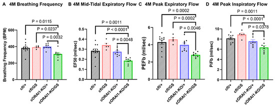 We found that breaths per minute (BPM, Figure 3A), mid-tidal expiratory flow (EF50, Figure 3B), peak expiratory flow (PeFb, Figure 3C), and peak inspiratory flow (PiFb) (Figure 3D) were all significantly reduced in 4M cORAI1-KO/GS mice compared to all other genotypes. These results indicate that ventilatory function is significantly reduced in 4M homotypic GS mice.
