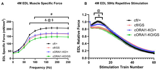 Homotypic cORAI1-KO/GS mice exhibit reduced ex vivo EDL peak force production. Average (±SEM) specific force-frequency curves (A) and peak specific force production during repetitive, high-frequency stimulation (60 trains of 50 H for 500 ms/train delivered every 2.5 s) (B) in EDL muscles from 4M cfl/+, cfl/GS, cORAI1-KO/+, and cORAI1-KO/GS mice. Significance was determined using 2-way ANOVA followed by Tukey’s multiple-comparisons post hoc test. & indicates p < 0.05 for cfl/+ vs. cfl/GS mice; @ indicates p < 0.05 for cfl/+ vs. cORAI1-KO/GS mice; $ indicates p < 0.05 for cORAI1-KO/+ vs. cORAI1-KO/GS mice; # indicates p < 0.05 for cfl/+ vs. cORAI1-KO/+ mice. N = 4, 4, 6, 5 for cfl/+, cfl/GS, cORAI1-KO/+ and cORAI1-KO/GS respectively.