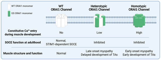 Summary of the main findings and predictions. ORAI1 hexameric channels can be comprised of only WT subunits (normal channels), heteromers of WT and GS subunits (heterotypic channels), or only GS subunits (homotypic GS channels) that exhibit distinct effects of ORAI1 channel function (i.e., constitutive- and store-operated calcium entry) and muscle structure/function during development and adulthood.