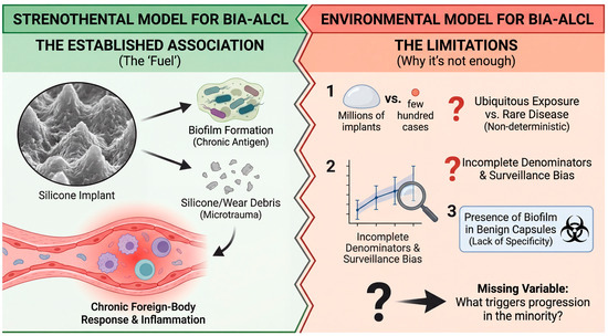 The “Texture–Biofilm” environmental paradigm: compelling association but incomplete causality. The left panel illustrates the currently established strong association (the “fuel”) between high-surface-area textured implants and chronic inflammation. Surface roughness promotes microbial adhesion (biofilm formation) and the generation of silicone particulate wear debris, both of which sustain a chronic foreign-body response and inflammatory infiltrate in the surrounding capsule. The right panel highlights critical limitations suggesting this environmental trigger alone is insufficient for malignant transformation. Despite tens of millions of women being exposed to textured implants worldwide, BIA-ALCL remains a rare disease, indicating a non-deterministic relationship. Furthermore, the interpretability of this association is constrained by surveillance bias, incomplete denominator data, and the observation that bacterial biofilms are also frequently detected on benign, non-tumor-associated capsules.