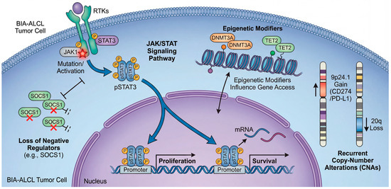 Across independent sequencing efforts, JAK–STAT activation emerges as the most reproducible molecular theme in BIA-ALCL [19,34,35,43]. Early whole-exome sequencing (WES) first highlighted activating mutations in JAK1 and STAT3, providing direct genetic evidence that constitutive STAT3 signaling can be hardwired into the tumor clone [34]. Subsequent comprehensive genomic profiling reinforced both the prevalence and diversity of genetic routes leading to this state: in one cohort analyzed with a broad haemato-oncology panel plus copy-number assessment, sequence variants consistent with JAK/STAT activation were highly prevalent, with activating STAT3 mutations detected in the majority [19]. Beyond STAT3 itself, lesions affecting negative regulators (for example, truncating alterations in SOCS1) or phosphatase control plausibly sustain pathway output, underscoring that BIA-ALCL selects for persistent STAT3 transcriptional competence rather than a single invariant mutation [19,44]. This convergence mirrors broader biology in ALK-negative ALCL, where STAT3 activation can be achieved through convergent mutations or kinase fusions. However, the apparent ubiquity of JAK/STAT lesions in BIA-ALCL suggests that the periprosthetic microenvironment may exert unusually strong selective pressure on this signaling pathway [19,45]. Across independent sequencing efforts, the most reproducible molecular theme is a potent convergence on STAT3 signaling. As depicted in the genomic landscape map in Figure 4, BIA-ALCL tumor cells employ a diverse array of genetic and epigenetic mechanisms to achieve the same end: constitutive STAT3 transcriptional competence. This includes direct activating mutations in JAK1 and STAT3 itself, disabling mutations in negative feedback regulators like SOCS1, and cooperating epigenetic dysregulation. This striking redundancy suggests an unusually strong microenvironmental selective pressure forcing the tumor clone to maintain this specific signaling hub.