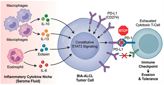 From chronic inflammation to immune escape: the cytokine-checkpoint axis in the periprosthetic niche. The peri-implant seroma fluid creates a unique cytokine milieu that shapes tumor evolution. The inflammatory niche, populated by macrophages and eosinophils, is enriched in cytokines such as IL-6, IL-10, and IL-13. These cytokines, particularly IL-13 and IL-6, act on the BIA-ALCL tumor cell to reinforce constitutive STAT3 signaling. In turn, STAT3 transcriptional activity drives the upregulation of the immune checkpoint ligand PD-L1 (CD274) on the tumor cell surface. The binding of tumor PD-L1 to PD-1 receptors on infiltrating cytotoxic T-cells provides a potent inhibitory signal, leading to T-cell exhaustion and tolerance, thereby allowing the malignant clone to escape immune surveillance within the capsular microenvironment.