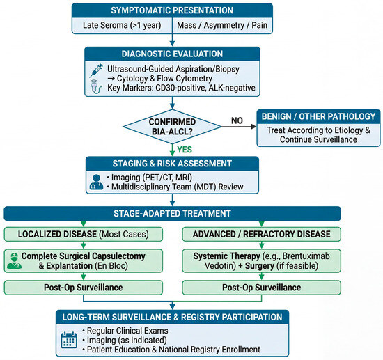 A second implication is that prevention and early detection are inseparable, because most cases are curable when recognized early and managed with guideline-concordant surgery and staging [1,11]. Accordingly, “precision” should be interpreted not only as molecular prediction but also as precision communication—ensuring that patients can recognize symptoms (late seroma, mass, asymmetry) and that care teams follow a reproducible diagnostic pathway [7,78]. A second critical implication of this new understanding is that early detection remains our most effective tool, as the disease is highly curable in its niche-confined state. We therefore propose a standardized clinical workflow to guide management (Figure 6). This pathway emphasizes the prompt evaluation of late seromas with targeted cytology (CD30 staining), rigorous staging for confirmed cases, and adherence to stage-adapted surgical protocols. Ensuring that care teams follow such a reproducible diagnostic and therapeutic pathway is fundamental to optimizing patient outcomes.