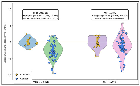 Across the qPCR-derived log2 fold-change (2−ΔΔCt) distributions, miR-99a-5p showed a clear and large separation between groups: cancer samples were shifted toward more negative log2FC values (greater downregulation vs. calibrator) compared with the controls, with a large standardized effect (Hedges g = −1.15; 95% CI −1.69 to −0.76) and a statistically significant difference (Mann–Whitney p = 9.25 × 10−5). In contrast, miR-1246 demonstrated substantially greater dispersion and overlap between groups, yielding only a modest effect that did not reach conventional significance (Hedges g = −0.45; 95% CI −0.93 to 0.00; and p = 0.0902), as seen in Figure 1.