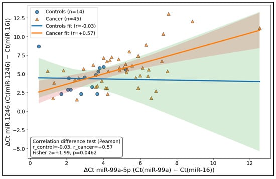 The relationship between the two miRNAs differed markedly by disease state: in controls (n = 14), ΔCt values for miR-99a-5p and miR-1246 were essentially uncorrelated (r = −0.03), whereas in cancer samples (n = 45), the same pair showed a moderate positive coupling (r = 0.57), consistent with coordinated behavior or shared variance emerging in the malignant context. Importantly, the difference in correlation strength between groups was statistically supported using Fisher’s z test (z = 1.99, p = 0.0462), indicating that cancer status is associated not only with the shifts in expression levels but also with a change in the miRNA–miRNA dependency structure (Figure 2).