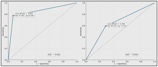 ROC plots are shown for miR-99a-5p and miR-1246 using ΔCt values as predictors. The annotated operating points correspond to the Youden-optimal thresholds reported in Table 6. The plotted summary curves reproduce the reported AUC and threshold performance characteristics (Figure 4).