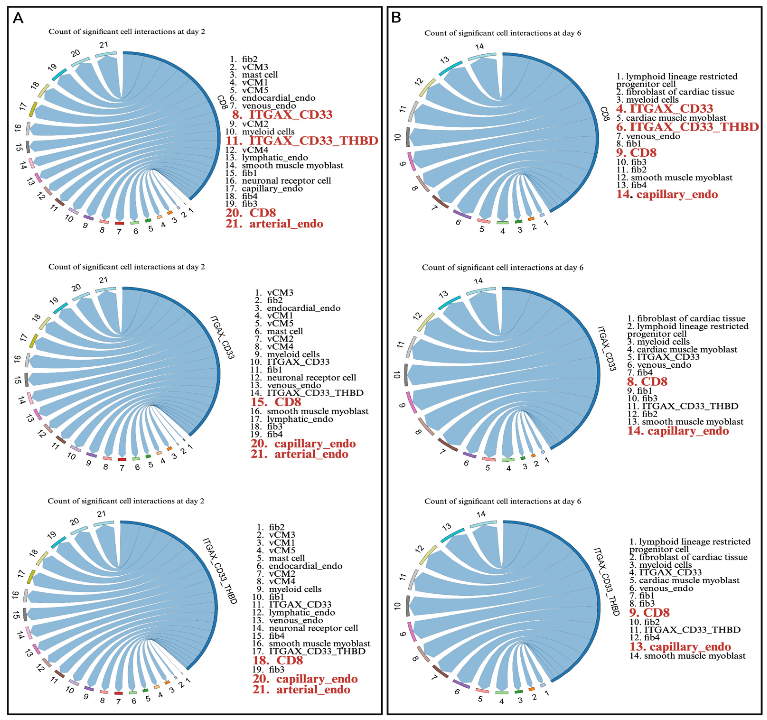 - Efremova, M.; Vento-Tormo, M.; Teichmann, S.A.; Vento-Tormo, R. CellPhoneDB: Inferring cell–cell communication from combined expression of multi-subunit ligand–receptor complexes. Nat. Protoc. 2020, 15, 1484–1506. [Google Scholar] [CrossRef] [PubMed]