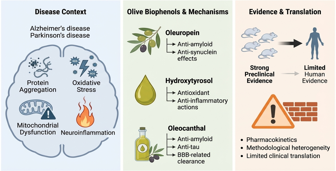 Olive Components (Biophenols or Polyphenols) in Neurodegenerative Disease Models and Clinical Studies: A Systematic Review of Evidence and Translational Barriers. Biomedicines 2026, 14, 761.