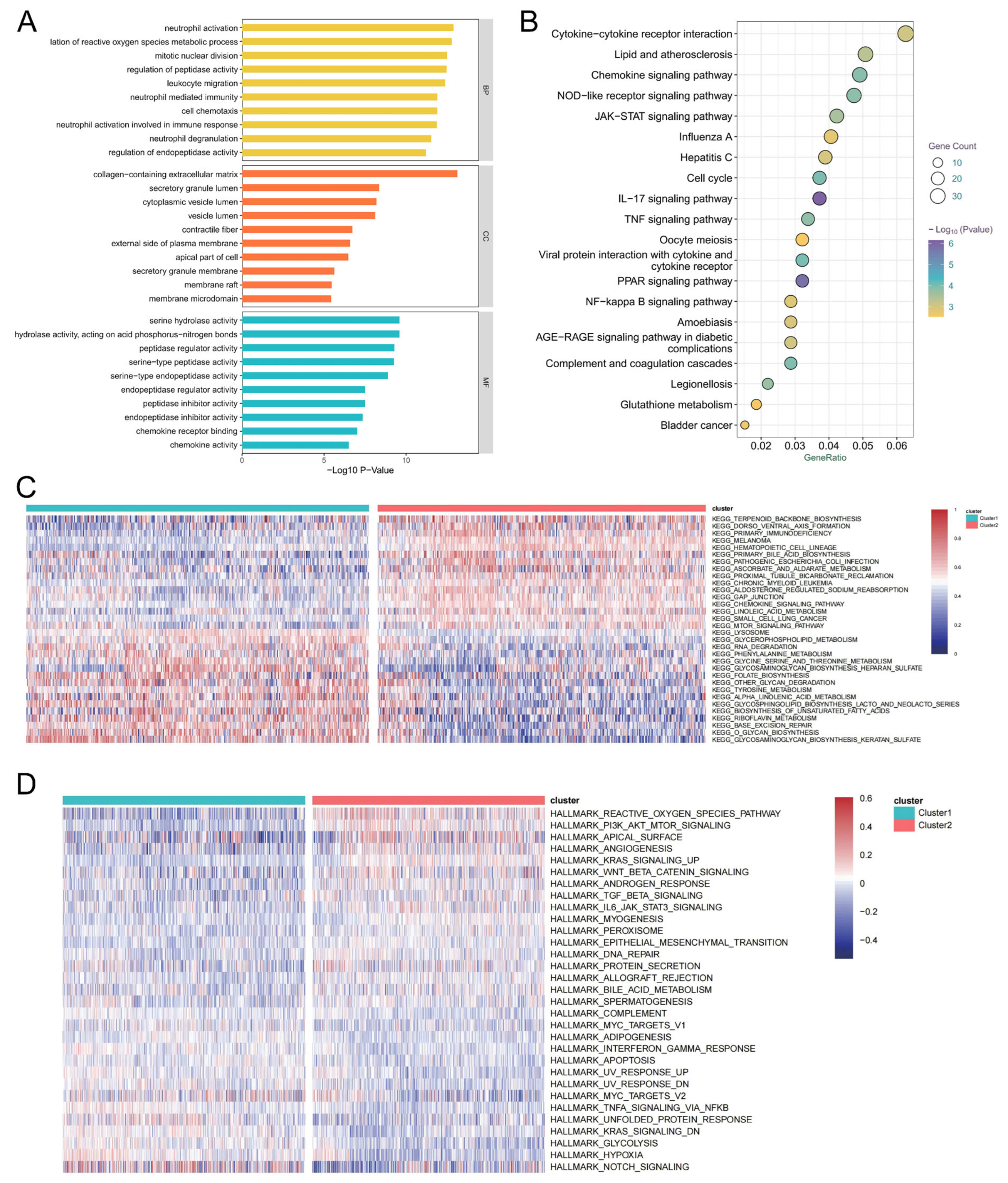 Figure 5A), the biological processes involved in which mainly include neutrophil activation, leukocyte migration, neutrophil-mediated immunity, neutrophil activation involved in the immune response, and neutrophil degranulation. Second, these DEGs were enriched in the cytokine–cytokine receptor interaction, lipid and atherosclerosis, chemokine signaling pathway, nucleotide-binding oligomerization domain (NOD)-like receptor signaling pathways, and Janus kinase-signal transducer and activator of transcription (JAK-STAT) signaling pathway upon KEGG pathway analysis (