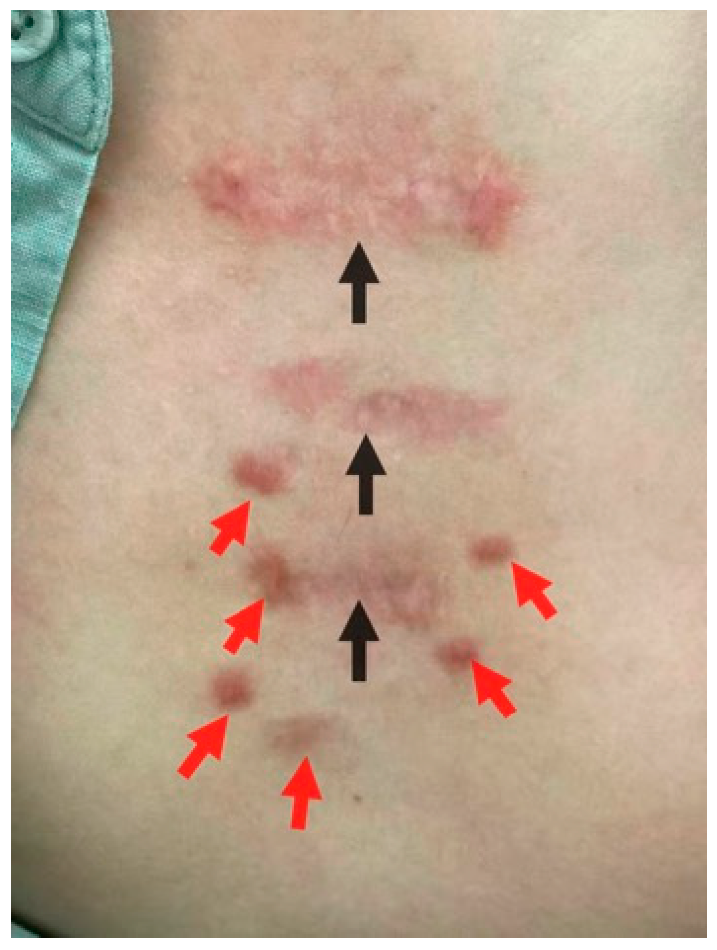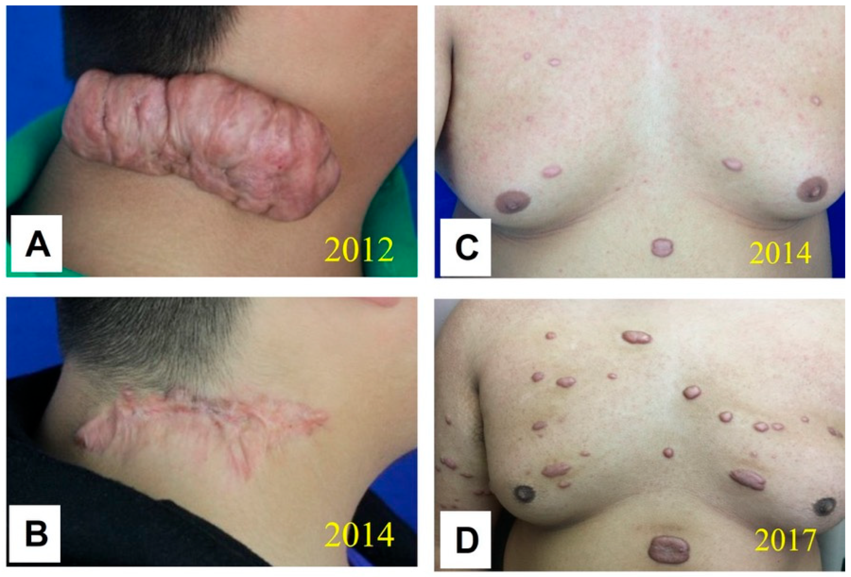 - Marneros, A.G.; Norris, J.E.; Olsen, B.R.; Reichenberger, E. Clinical genetics of familial keloids. Arch. Dermatol. 2001, 137, 1429–1434. [Google Scholar] [CrossRef] [PubMed]