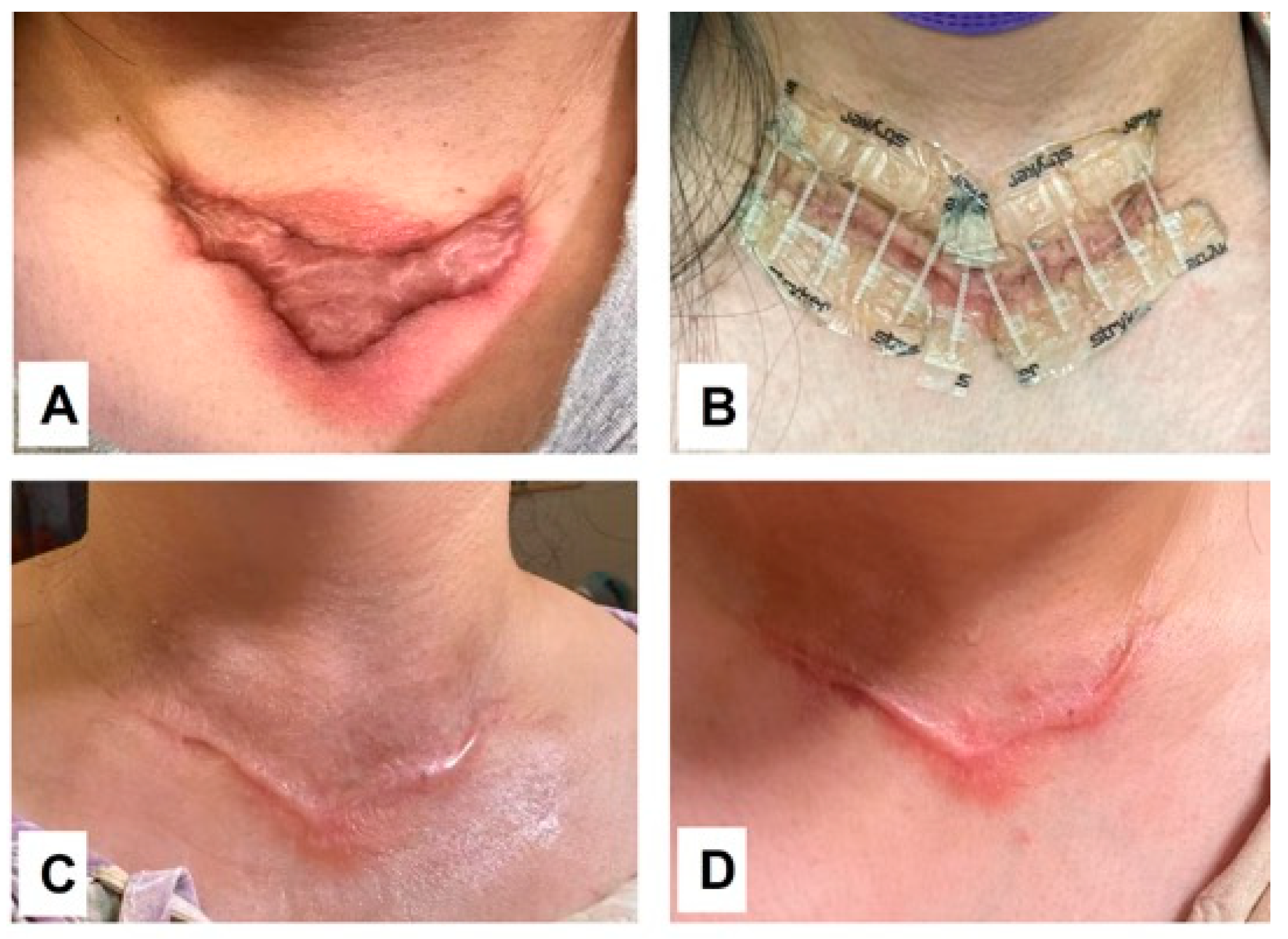 - Gold, M.H.; McGuire, M.; Mustoe, T.A.; Pusic, A.; Sachdev, M.; Waibel, J.; Murcia, C. Updated international clinical recommendations on scar management: Part 2—Algorithms for scar prevention and treatment. Dermatol. Surg. 2014, 40, 825–831. [Google Scholar] [CrossRef] [PubMed]