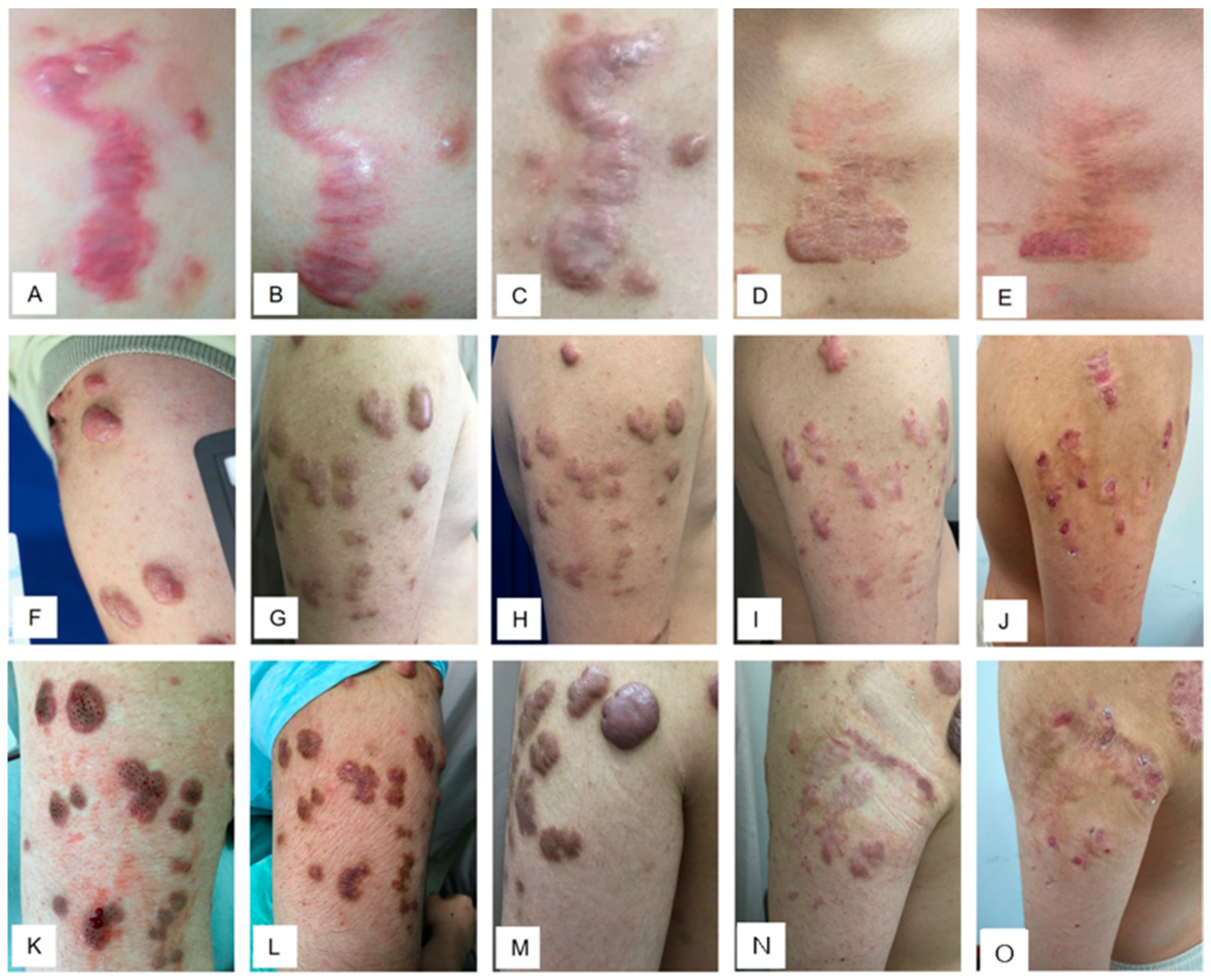 - Placik, O.J.; Lewis, V.L., Jr. Immunologic associations of keloids. Surg. Gynecol. Obstet. 1992, 175, 185–193. [Google Scholar] [PubMed]