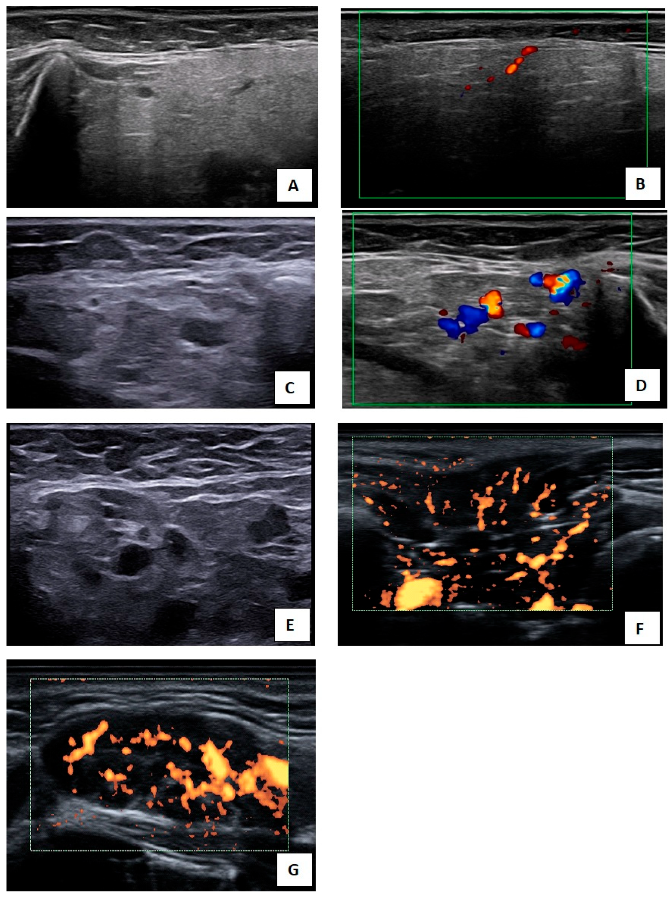 - Zabotti, A.; Manfrè, V.; Nano, A.; Giovannini, I.; Fabro, C.; Quartuccio, L. Correlation between colour Doppler activity and parenchymal alterations in salivary glands of patients with primary Sjögren’s disease. Clin. Exp. Rheumatol. 2025, 43, 2202–2208. [Google Scholar] [CrossRef] [PubMed]