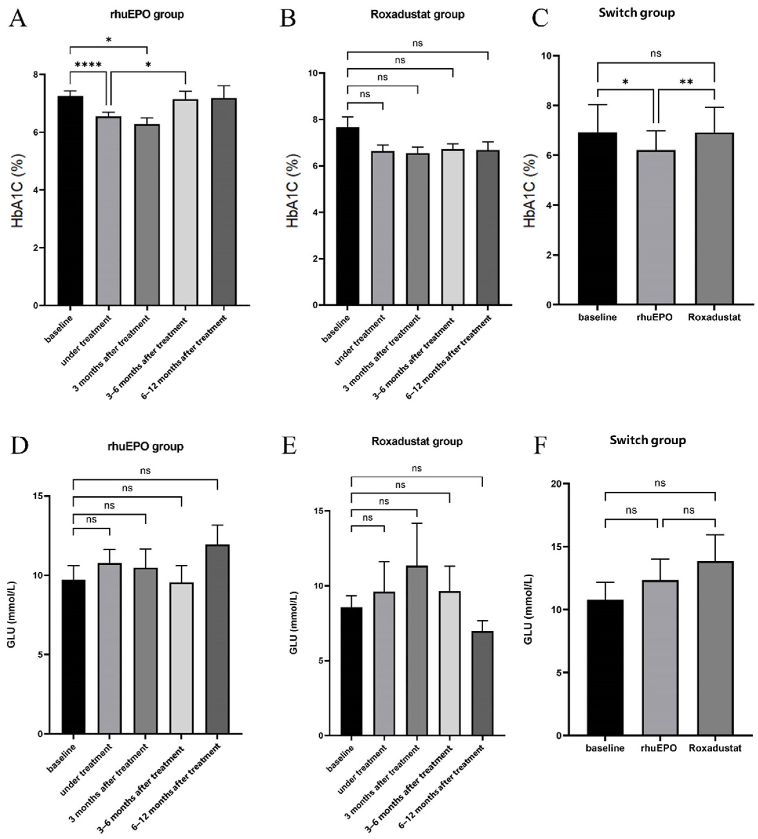 - Switch group included 95 patients who met the following criteria: (a) continuous rHuEPO treatment for >3 months; (b) an interval of <1 month between discontinuation of rHuEPO and initiation of Roxadustat; (c) continuous Roxadustat treatment for >3 months; (d) no change in hypoglycemic agents during the treatment period.