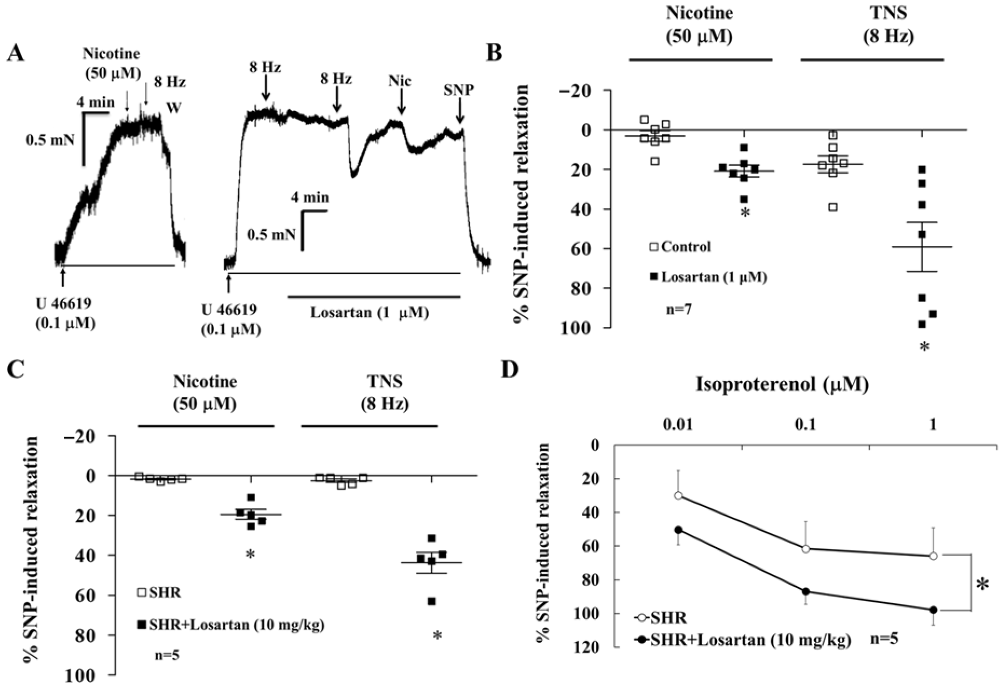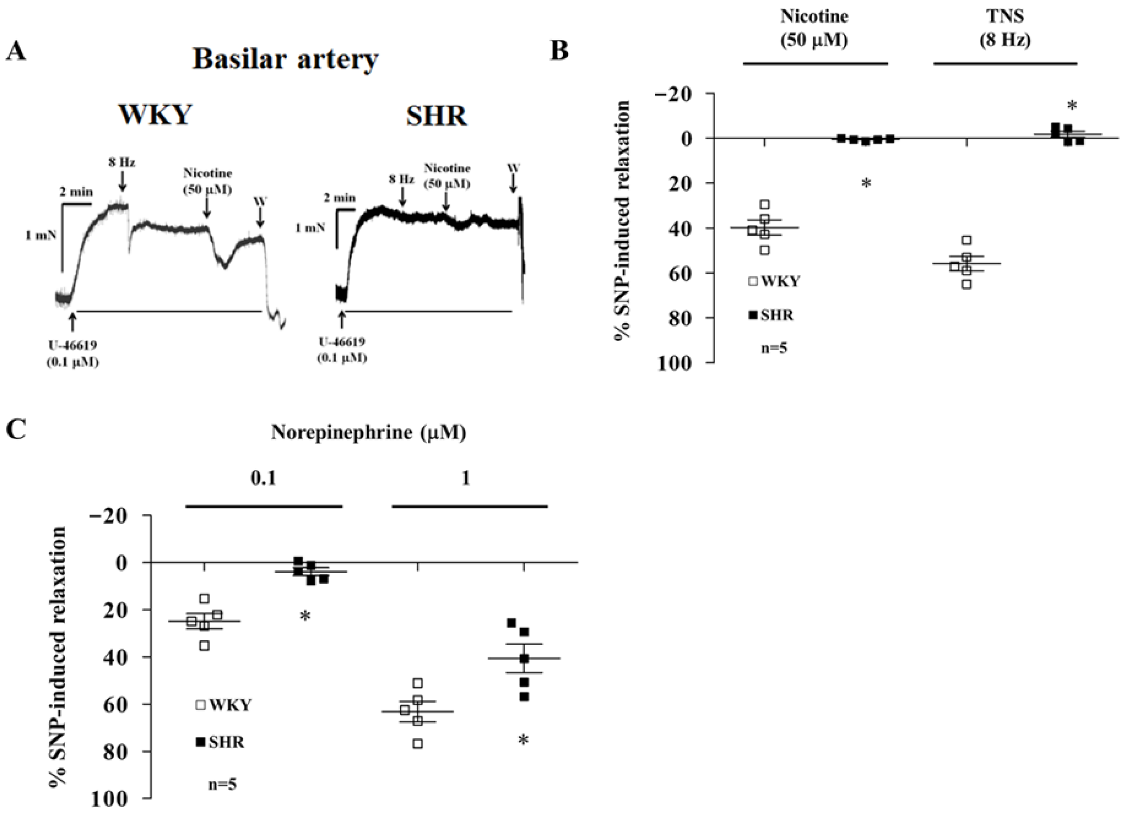 3.1. Nicotine- and TNS-Induced Relaxation of Basilar Arterial Rings in SHRs