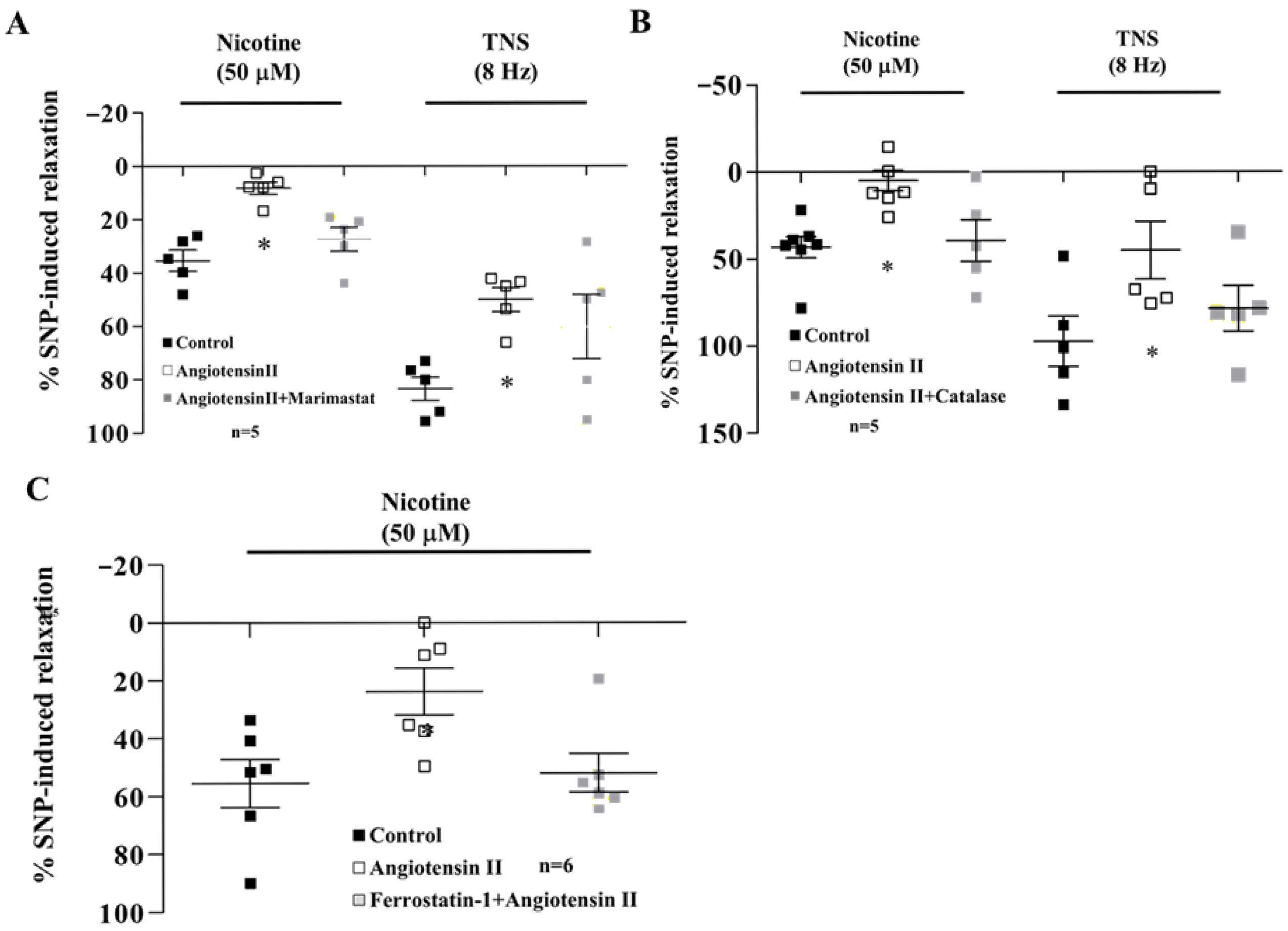 3.6. Effects of Marimastat, Catalase, and Ferrostatin-1 on Ang II-Mediated Inhibition