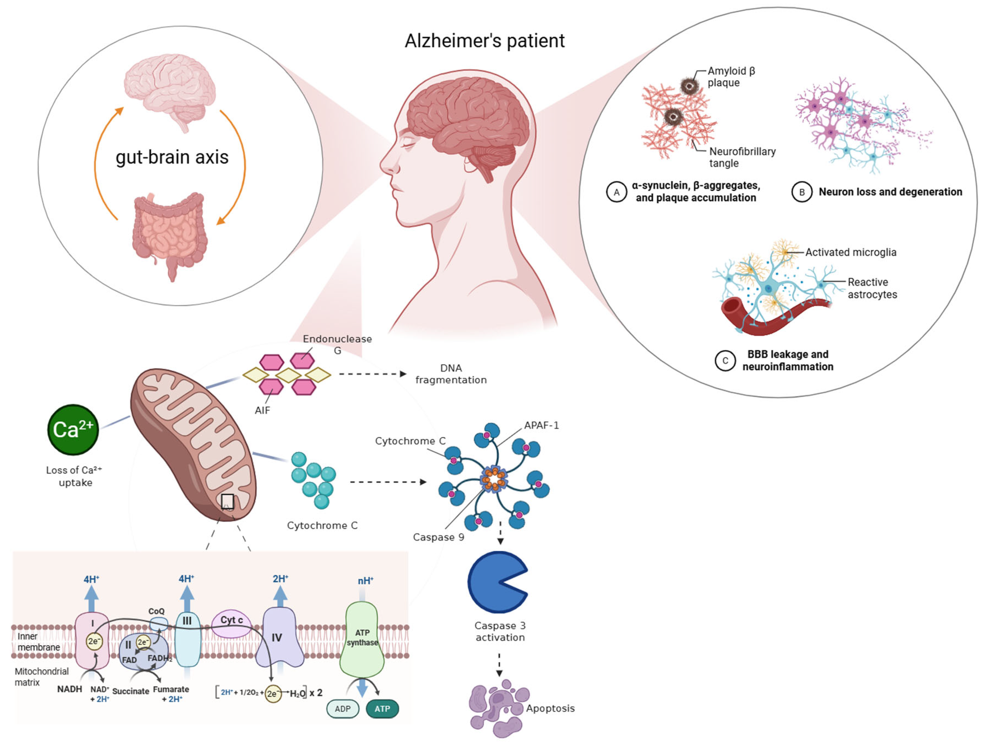 | Mitochondrial Dysfunction | ↑ LPS and bacterial amyloids ↓ Indole derivatives & SCFAs | Mitochondrial permeability transition, ATP depletion, impaired oxidative phosphorylation, ↑ ROS and Aβ aggregation | [17,32,55] |