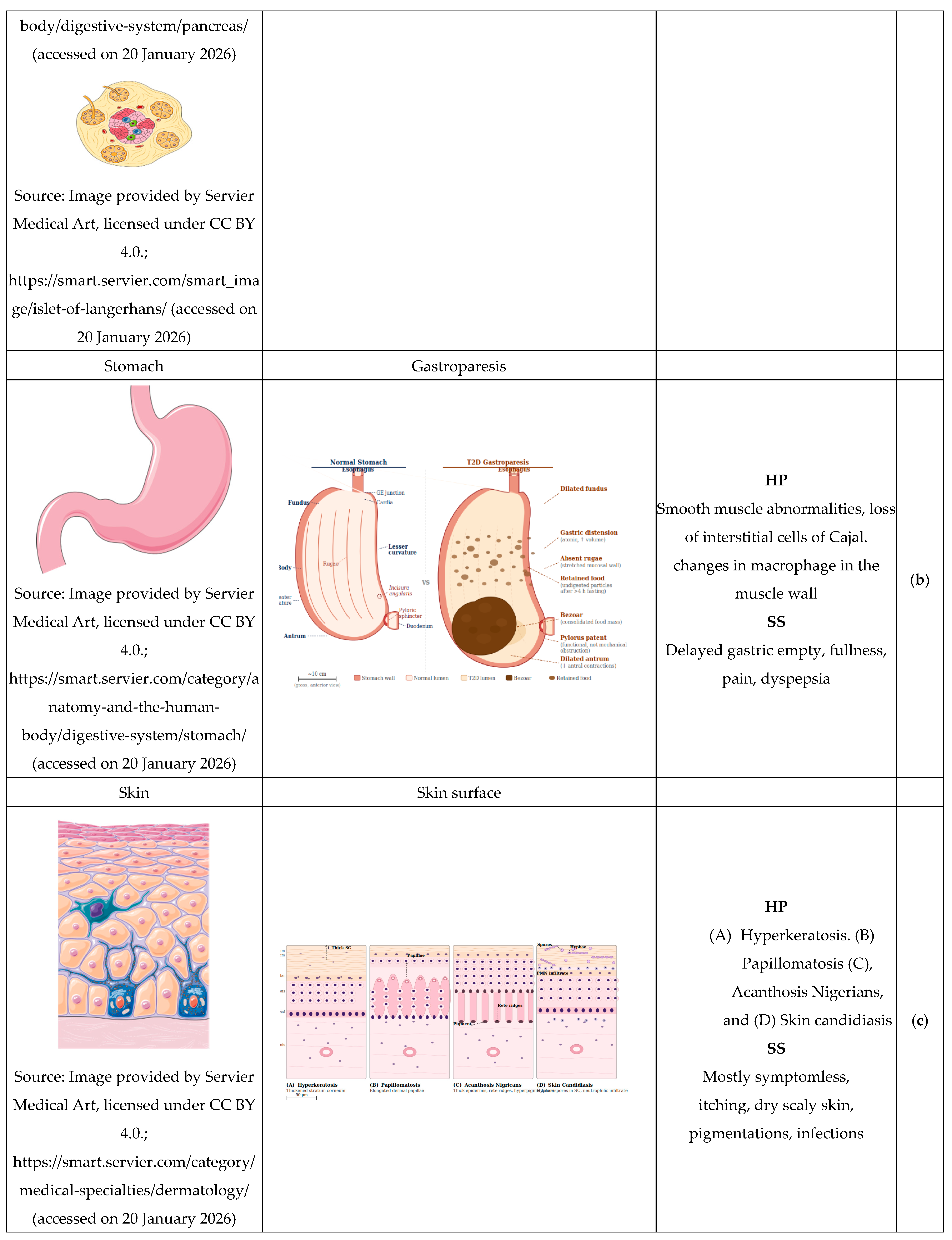 - Gut luminal pH and gut motility: It was previously shown that hyperosmolar solutions and HCl induce more frequent and large amplitude segmental gut contractions, whereas lipid and bile induce fewer and smaller amplitude contractions in humans [137]. The compartmentalization strategy of the esophagogastroduodenal region is to restrict high acid content to the stomach and to control acid passage to the duodenum via the lower esophageal sphincter (LES) and pyloric sphincters [138]. Both sphincters are under the control of neural reflexes involving acid-sensitive neurons that adjust the tone of the sphincters to balance the levels of acid present in the esophagus, stomach, and duodenum with the mucosal defense in these compartments [138,139]. If excessive gastric acid enters the duodenum, a duodenopylorogastric reflex is elicited, leading to contraction of the pylorus and inhibition of gastric motility, an effect that halts further gastric emptying. These coordinated motor reactions are governed by acid-sensitive neurons that, in turn, activate multiple neural circuits involving enteric, sympathetic, and vagal nerve pathways [139]. The activity of the LES is determined by two different motor programs initiated by the presence of acid in the esophagus. The first promotes esophageal peristalsis and transport of its content towards the stomach, and the second program leads to relaxation of the LES [139]. The association between delayed gastric emptying (GE) and diabetes has been known for almost a century [140]. It has been reported that 28–65% of diabetic patients experience delayed GE, which leads to a 300% longer gastric transit time in diabetic patients when compared with healthy subjects [141] (Figure 3B(b)). The significant changes in gastric motility and gastric transit time can impact the extent of absorption of diet and orally administered drugs [141]. Other changes in gut motility can lead to constipation, diarrhea, bloating, and abdominal pains (Figure 3A(e)). The positive responses of these symptoms to proton pump inhibitors (PPIs) suggest a possible major role for CMAD in gut motility disturbances in T2D.