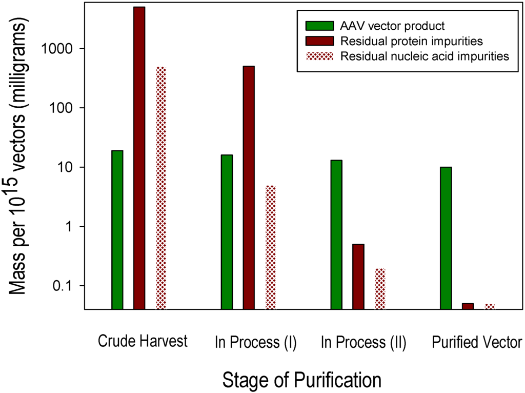 Impurities remaining after vector purification include residual levels of proteins and nucleic acids that derive from the components of the cell culture system within which the vector product is generated. Examples of two abundant sources of protein impurities are residual proteins derived from the production cells (host cell proteins) and from bovine serum (if used), such as residual bovine serum albumin. Similarly, two abundant sources of nucleic acid impurities are residual nucleic acid constituents of the production cells (host cell DNA and RNA) and DNA from helper components (e.g., plasmids or viruses) added to support vector production. These biological components of cell culture-based production systems are highly abundant and diverse prior to purification, and their substantial removal from the small relative mass of the vector generated is a critical objective for AAV vector purification process development and optimization. Residual host cell DNA is present in two forms: (1) as a nuclease-sensitive process-related impurity, i.e., non-specifically co-purified with the desired AAV vector product; and (2) as a nuclease-resistant product-related impurity, i.e., encapsidated within AAV particles. Minimizing these distinct forms of residual host cell DNA requires different manufacturing process optimization strategies. A model of the purification power and specificity that is required to purify AAV vectors generated in cell culture using helper virus-free transient transfection of Human Embryonic Kidney 293 (HEK293) cells is provided in the following example in which the objective is the recovery of 1015 highly purified recombinant AAV vectors, i.e., DNAse-resistant vector genome particles as measured by qPCR and substantially free of process-and product-related impurities. This example “lot” size corresponds to that required to support a Phase 1 clinical trial for many diseases. Approximately 10 mg of an AAV vector drug substance (1015 vector particles containing ~6.5 mg of AAV capsid protein and ~3.5 mg of vector DNA) must be purified from a cell culture milieu containing ~4 g of non-vector protein (3 g of HEK293 cellular protein from ~1010 cells and ~1 g of fetal bovine serum protein) and ~350 mg of non-vector nucleic acids (320 mg of HEK293 cellular nucleic acids and 30 mg of production plasmid DNA). Figure 1 shows approximate quantities of vector and impurities at the pre-purification (crude harvest) stage, two sequential intermediate in-process stages of purification and after completion of purification. In order to reduce the initially abundant and diverse protein and nucleic acid impurities to a level corresponding to ≤2% of the desired vector product, they must be selectively reduced approximately 105- and 104-fold, respectively, by a process that also achieves an acceptable (e.g., ≥50%) yield of the desired AAV vector.