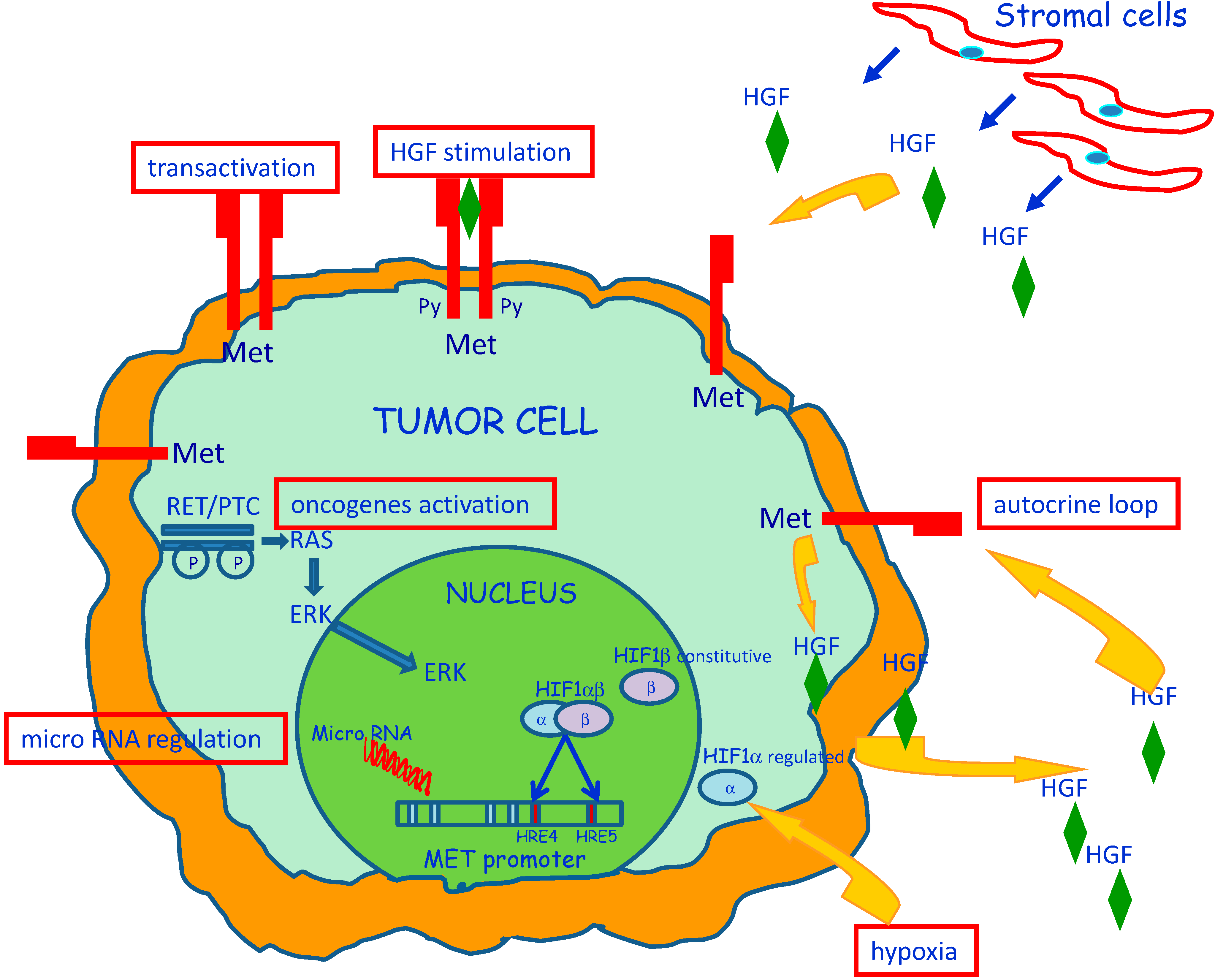 Transforming events that induce Met protein over-expression in papillary carcinoma of the thyroid. Increased MET transcription can be due by a combination of intracellular and extracellular factors as summarized in the image. Dysregulation or mutation of other oncogenes, may contribute to regulate Met protein levels and also MET promoter activity modification induced by methylation or interaction with microRNAs can have a crucial role. Up-regulation of MET transcription can be caused also by extracellular factors, such as HGF stimulation and hypoxia conditions.