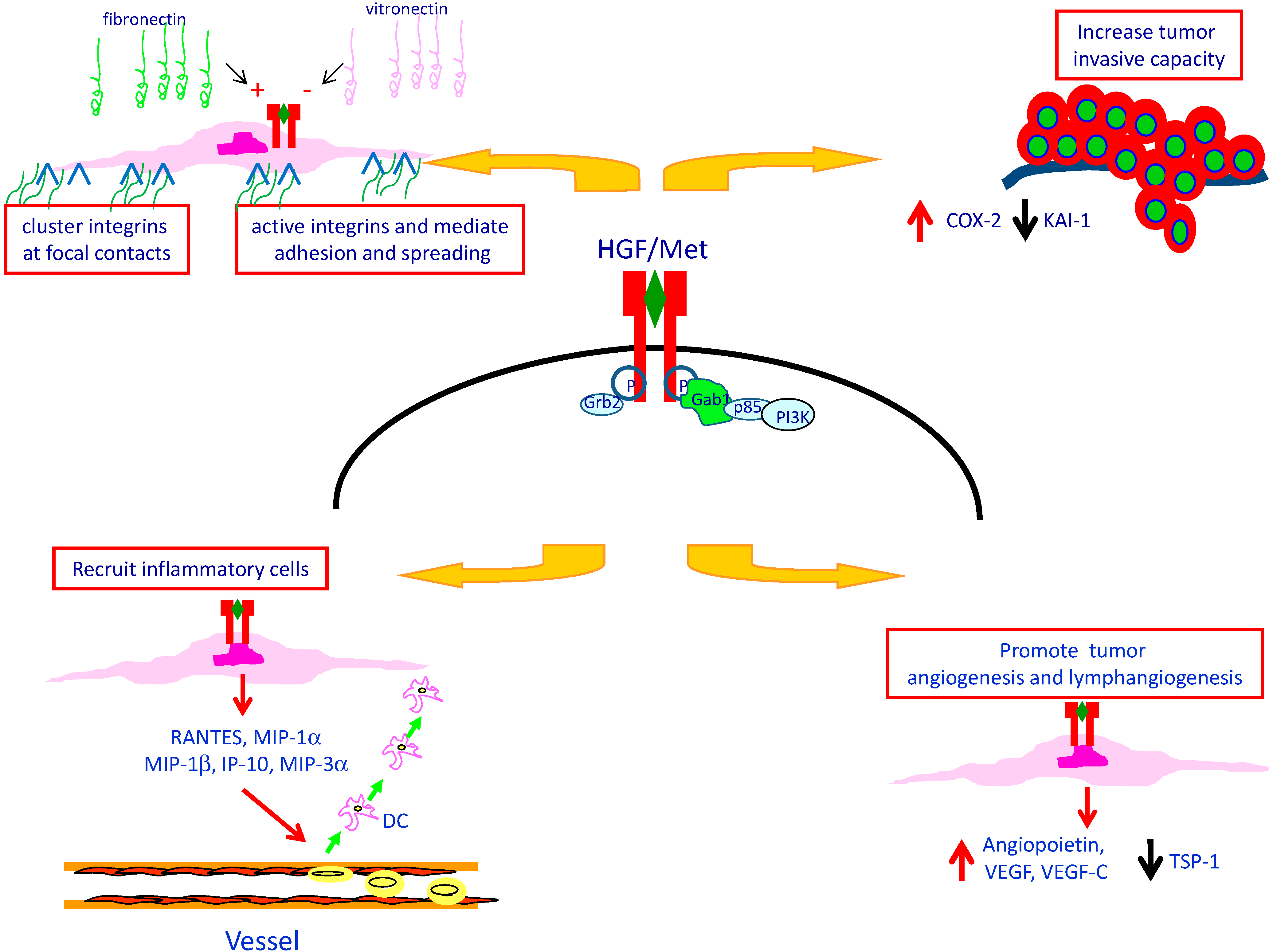 The Met/HGF invasive growth program. HGF activates the specific receptor Met inducing its dimerization. Once activated, Met recruits multiple adaptors and transducers on its multifunctional docking site. Specific pathways lead to different biological responses, which result in invasive growth. In papillary carcinoma of the thyroid, HGF stimulates the adhesion of cells to ECM components inducing firm attachment and spreading and enhancing migratory and invasion capacity of PTC cells. The Met/HGF interaction may interfere with tumor microenvironment, promoting tumor vascularization and releasing chemotactic factors involved in the recruitment of inflammatory cells into the tumor.